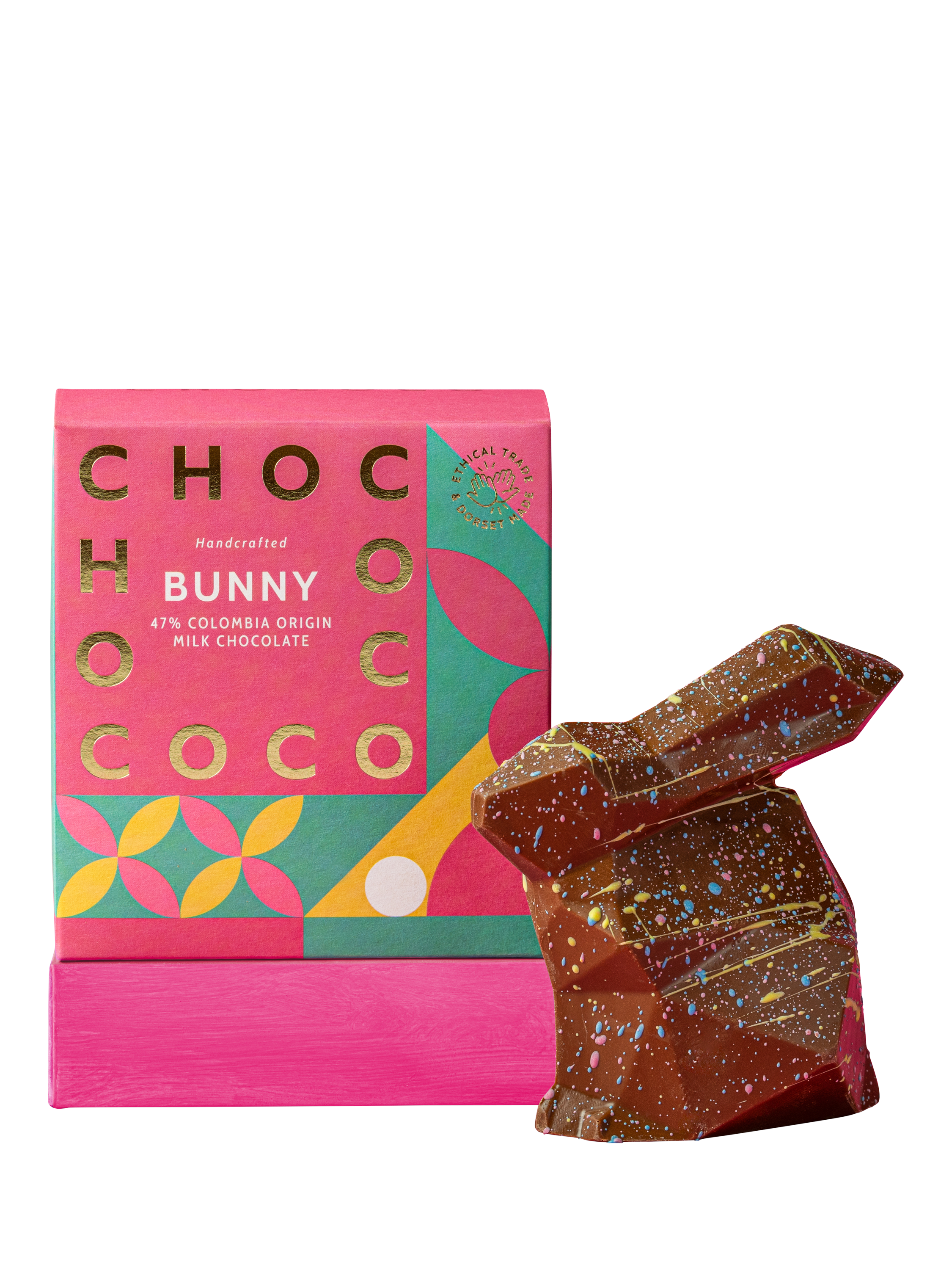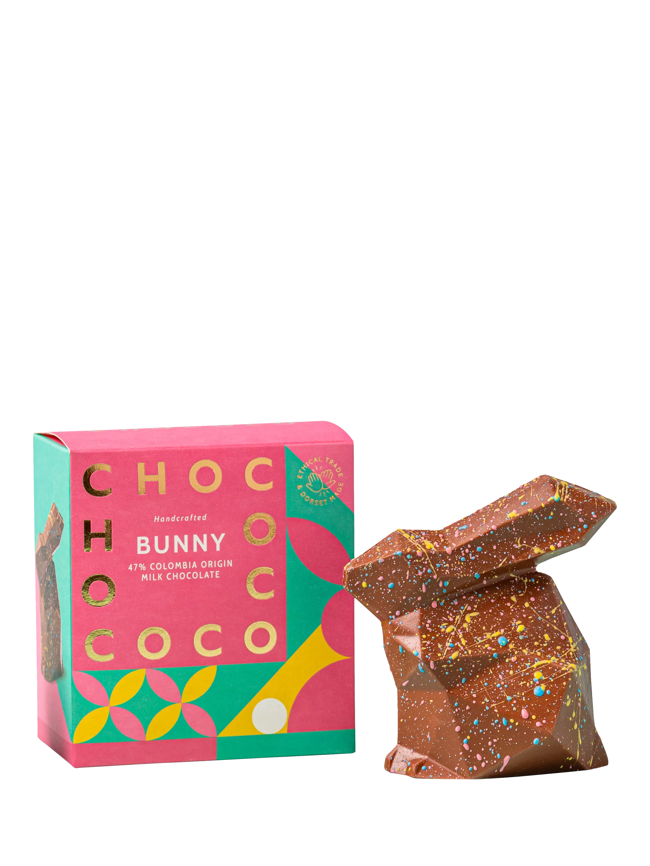 Crafted and decorated in Dorset by artisan chocolatiers, Chococo's milk chocolate Easter Bunny is made with Gold Star Great Taste Award winning single origin 47% milk chocolate.