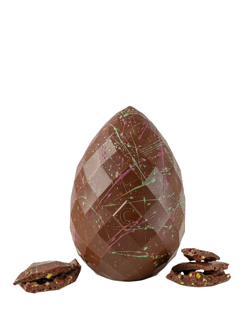 Crafted by artisan chocolatiers in Chococo's Dorset chocolate kitchen, this beautiful, hand decorated egg is made with award winning 47% Colombian milk chocolate, freeze dried raspberries and roasted pistachio pieces.