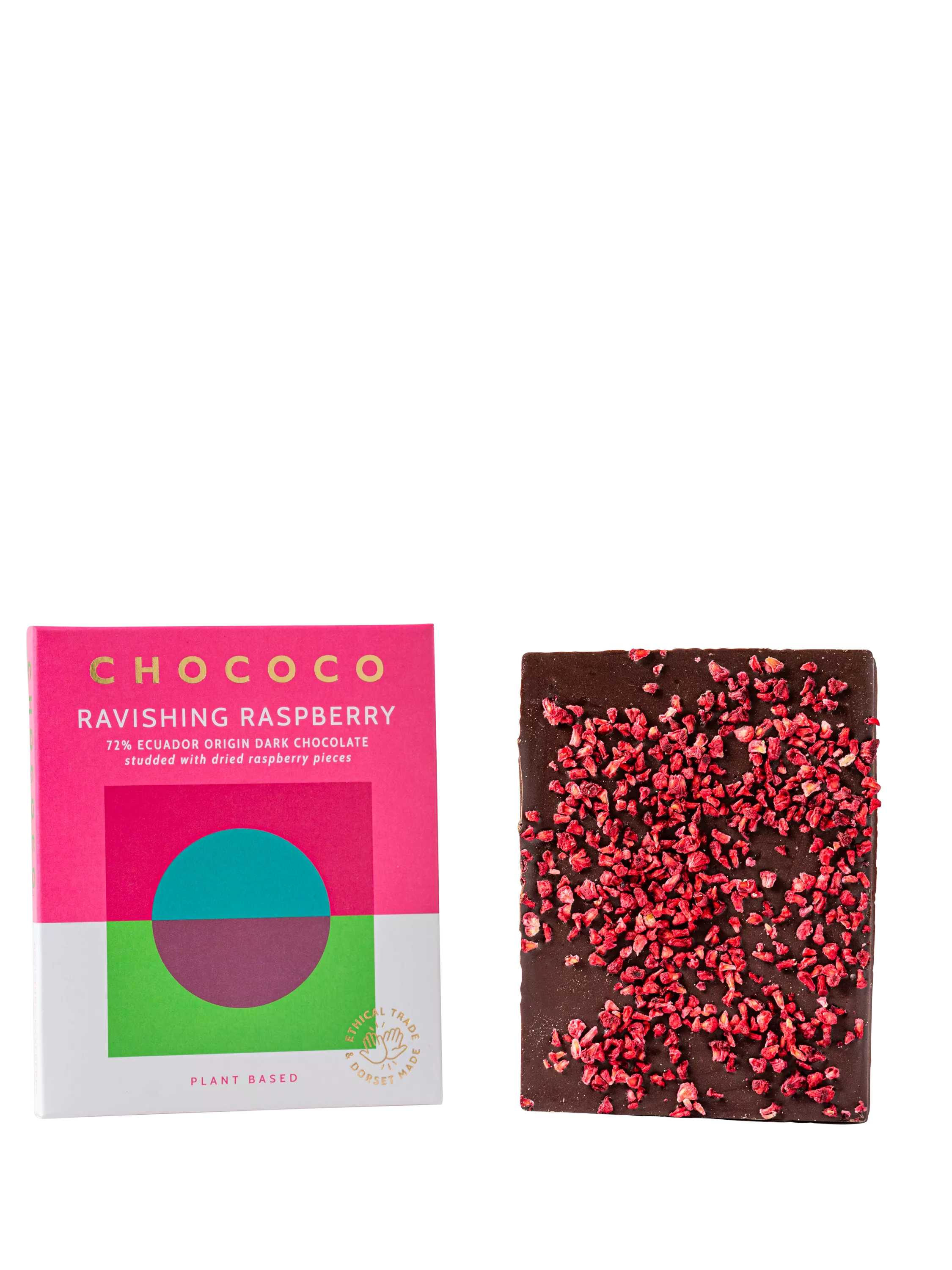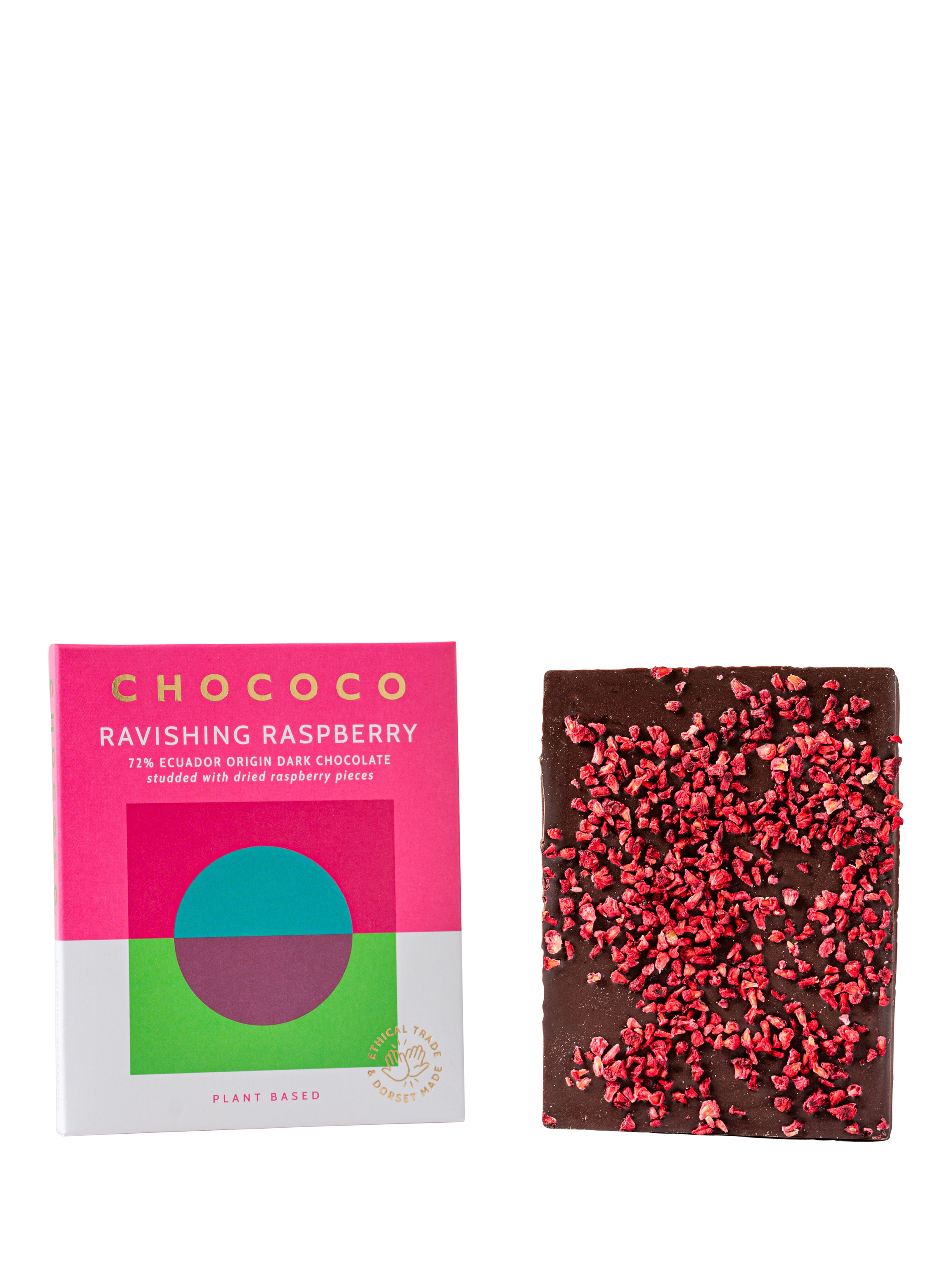 Crafted in Dorset by artisan chocolatiers, Chococo's Dark Chocolate Ravishing Raspberry bar is made with Gold Star-Great Taste award-winning 72% Ecuador chocolate and studded with luscious freeze dried raspberry pieces.