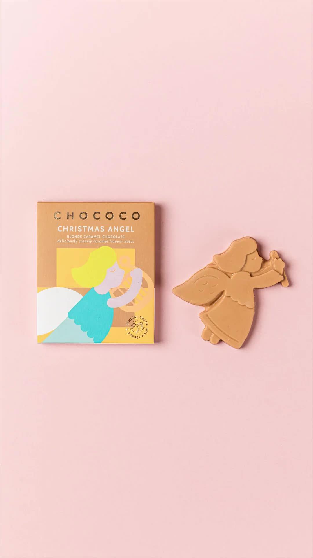 Chococo's Christmas Angel is handcrafted in their Dorset factory by artisan chocolatiers using caramelised white 'blonde' chocolate.