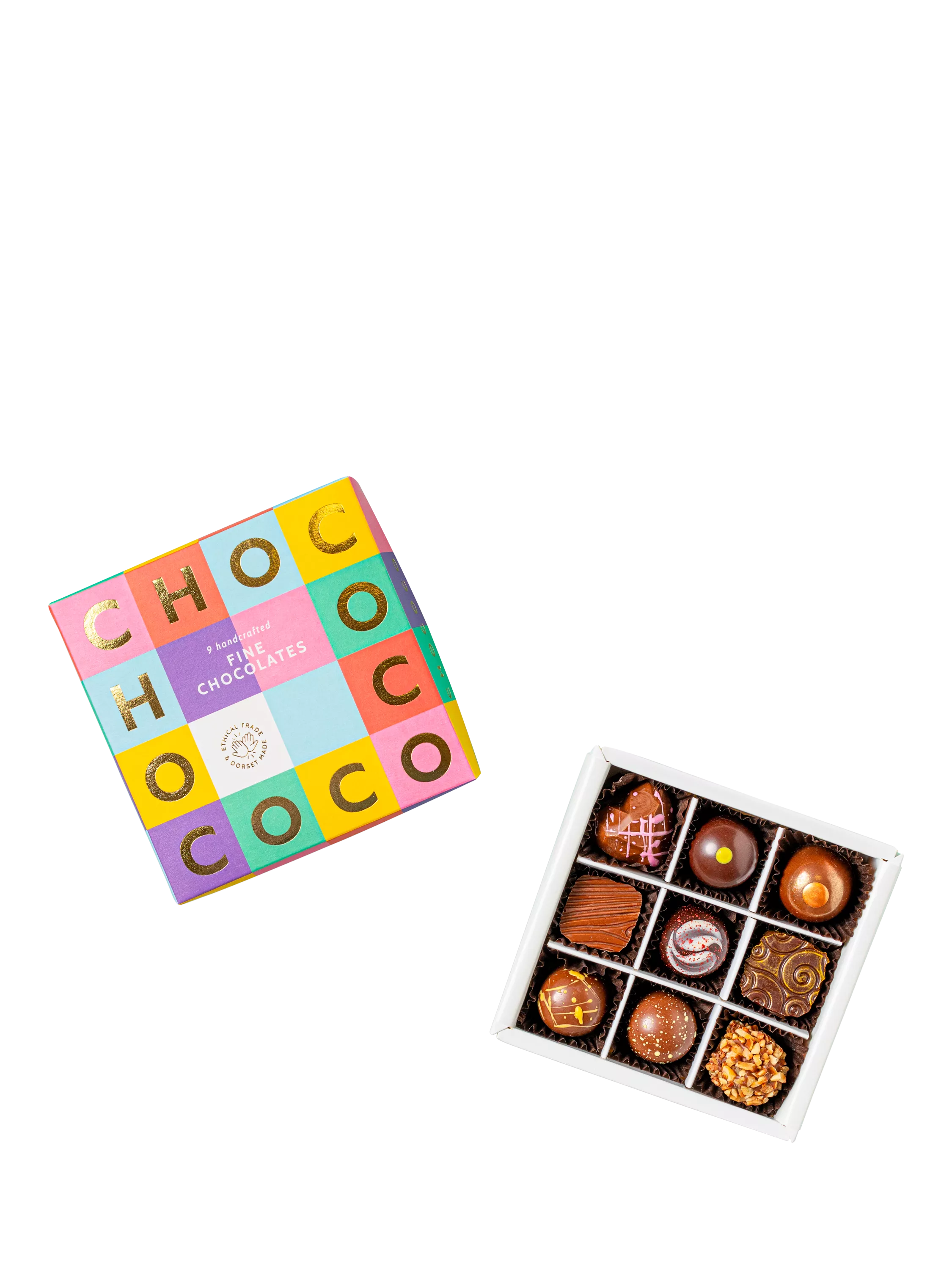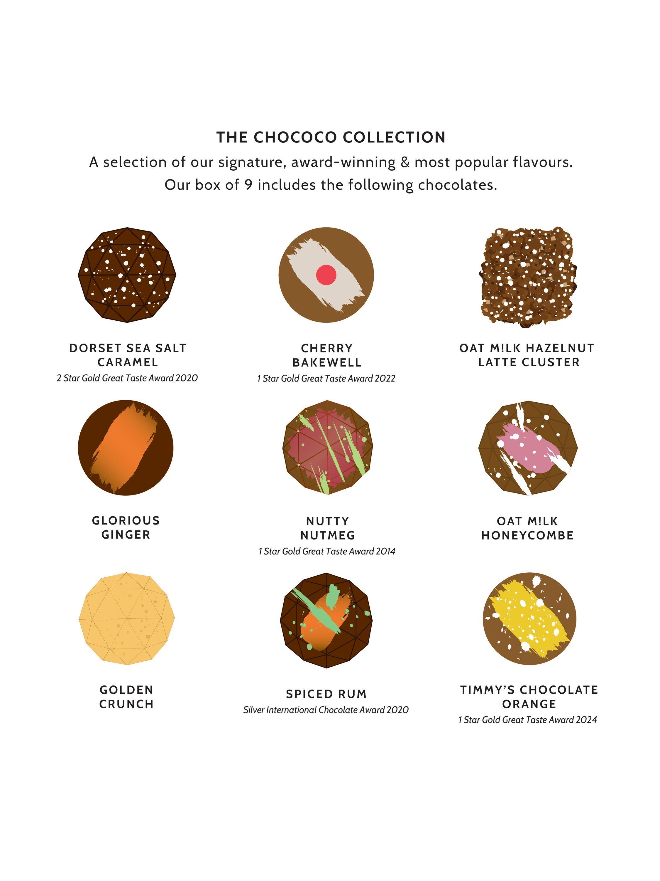 Crafted and decorated in Dorset by artisan chocolatiers, Chococo's Small Chocolate Collection box contains an array of nine delicious, award-winning chocolates. Including flavours such as Dorset Sea Salt, Mollases and Brown Butter, Cherry Bakewell and Caramel.