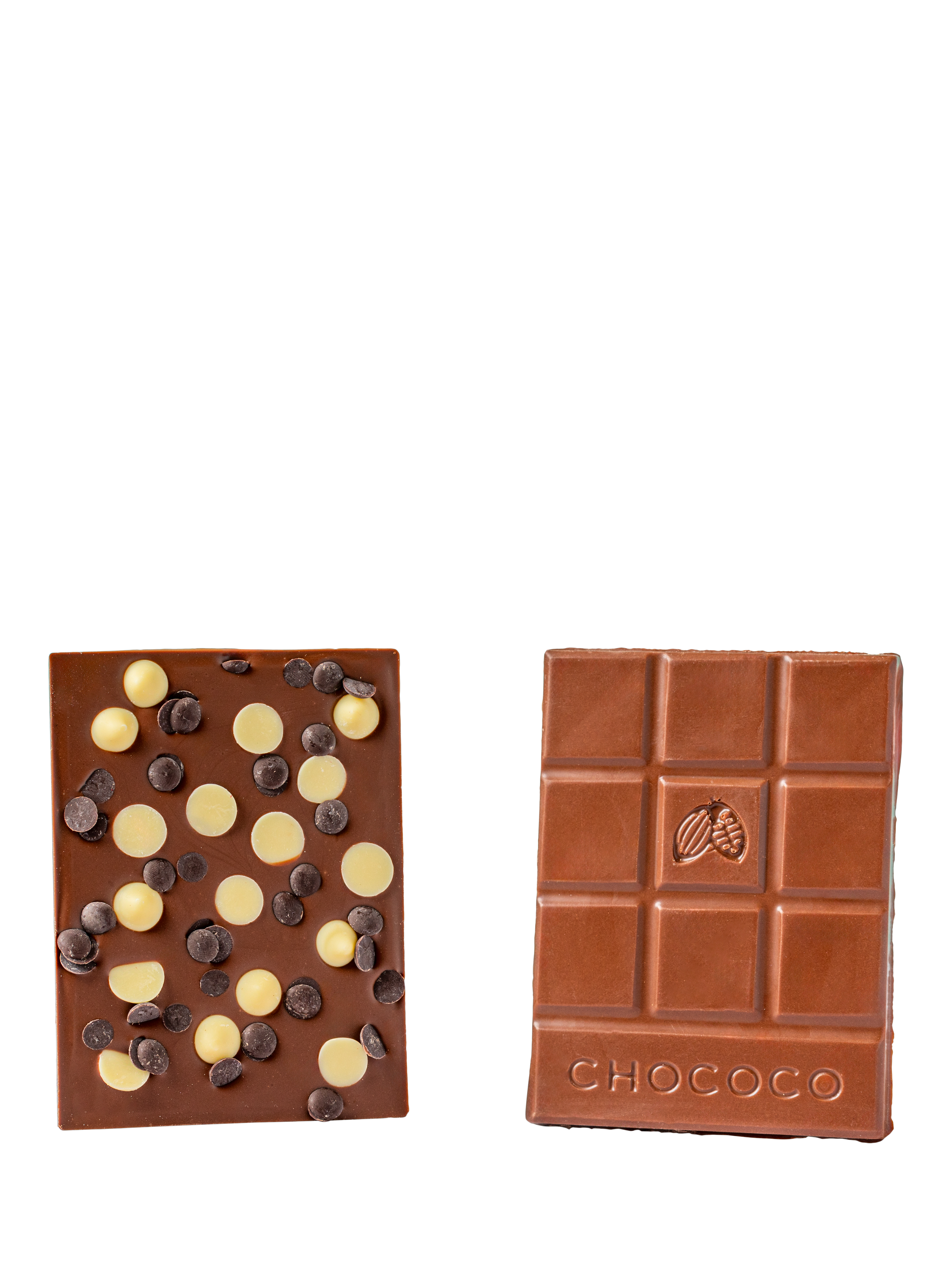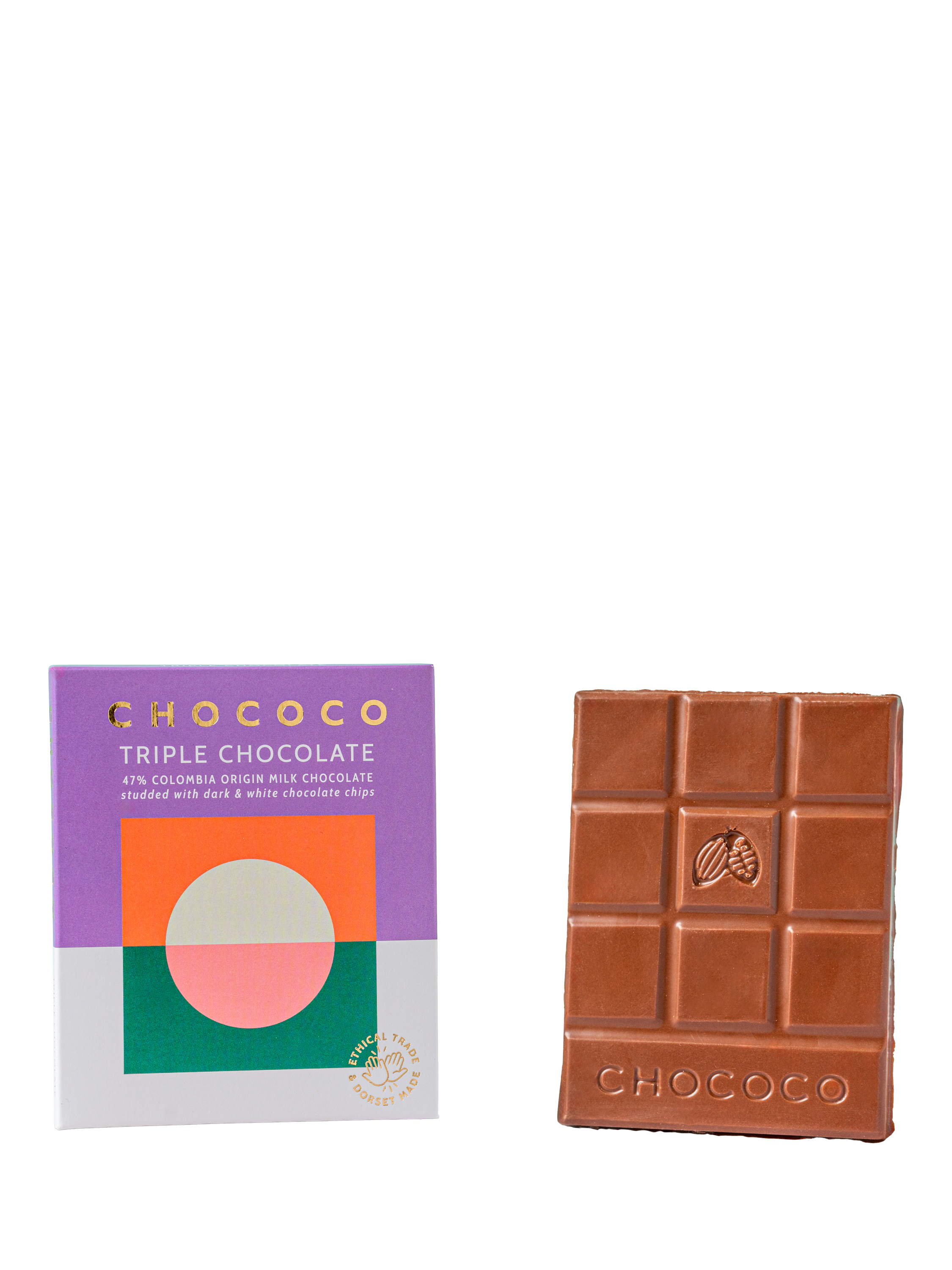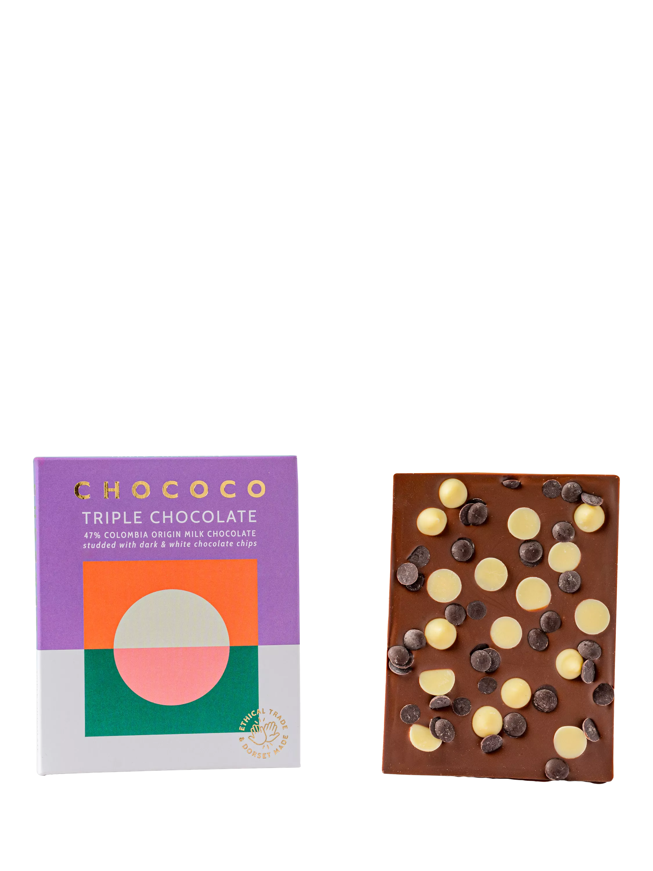 Crafted in Dorset by artisan chocolatiers, Chococo's Triple Chocolate Bar is made with Gold Star-Great Taste, award-winning single origin 47% milk chocolate, studded with creamy white chocolate buttons and dark chocolate chips.