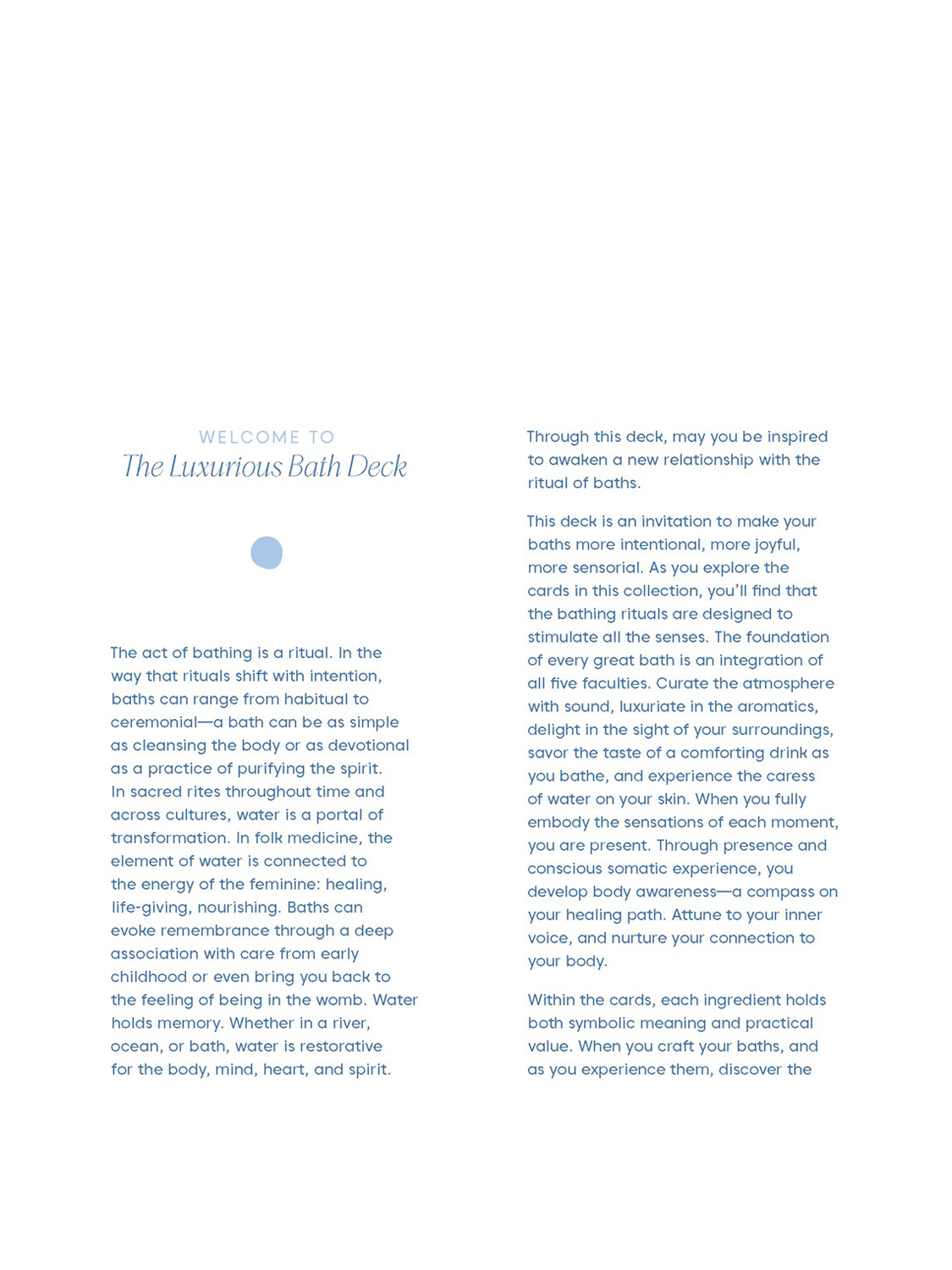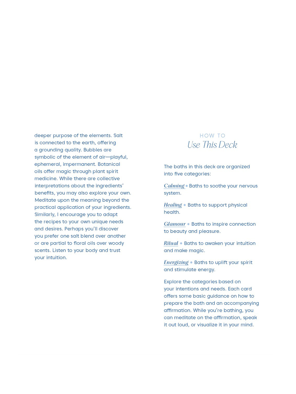 The LuxuriousBath Deck invites you to immerse yourself in the restorative powers of luxurious baths. Written by herbalist Leah Moth, the deck includes 50 soothing bath recipe cards using blends of herbs, salts, essential oils, and florals to promote calm, stress relief, and recovery. Each card features soothing artwork, a description of the bath's nourishing properties, a short meditative prompt, and an ingredient list with botanicals, emollients, crystals, candles, and more.