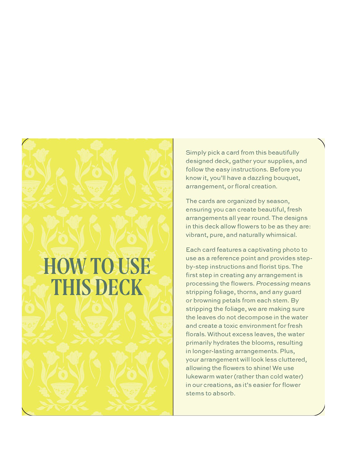 Packed with easy-to-follow instructions, gorgeous photographs, and recipes for 30 breathtaking floral arrangements, this handy DIY deck gives you the power to create floral displays that will elevate any occasion.