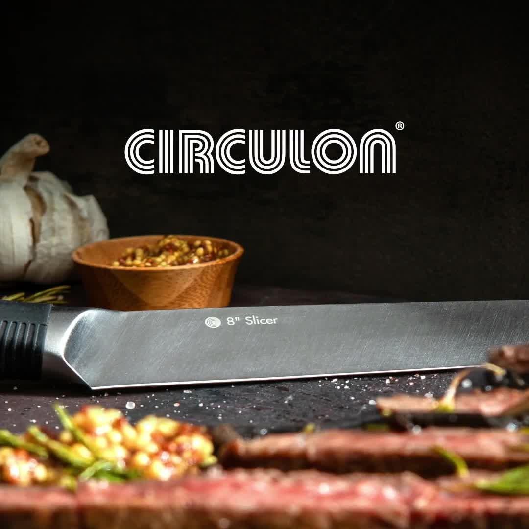 Circulon® kitchen knives are made with high-performance Japanese steel for exceptional strength and durability. Designed for precise cutting, the dual tapered edges and the brand's blade technology ensure excellent food release. The handles have textured hi-low grooves for superior grip and are ergonomically designed to sit comfortably in the hand. The knives are also well balanced for controlled cutting and ease of use.