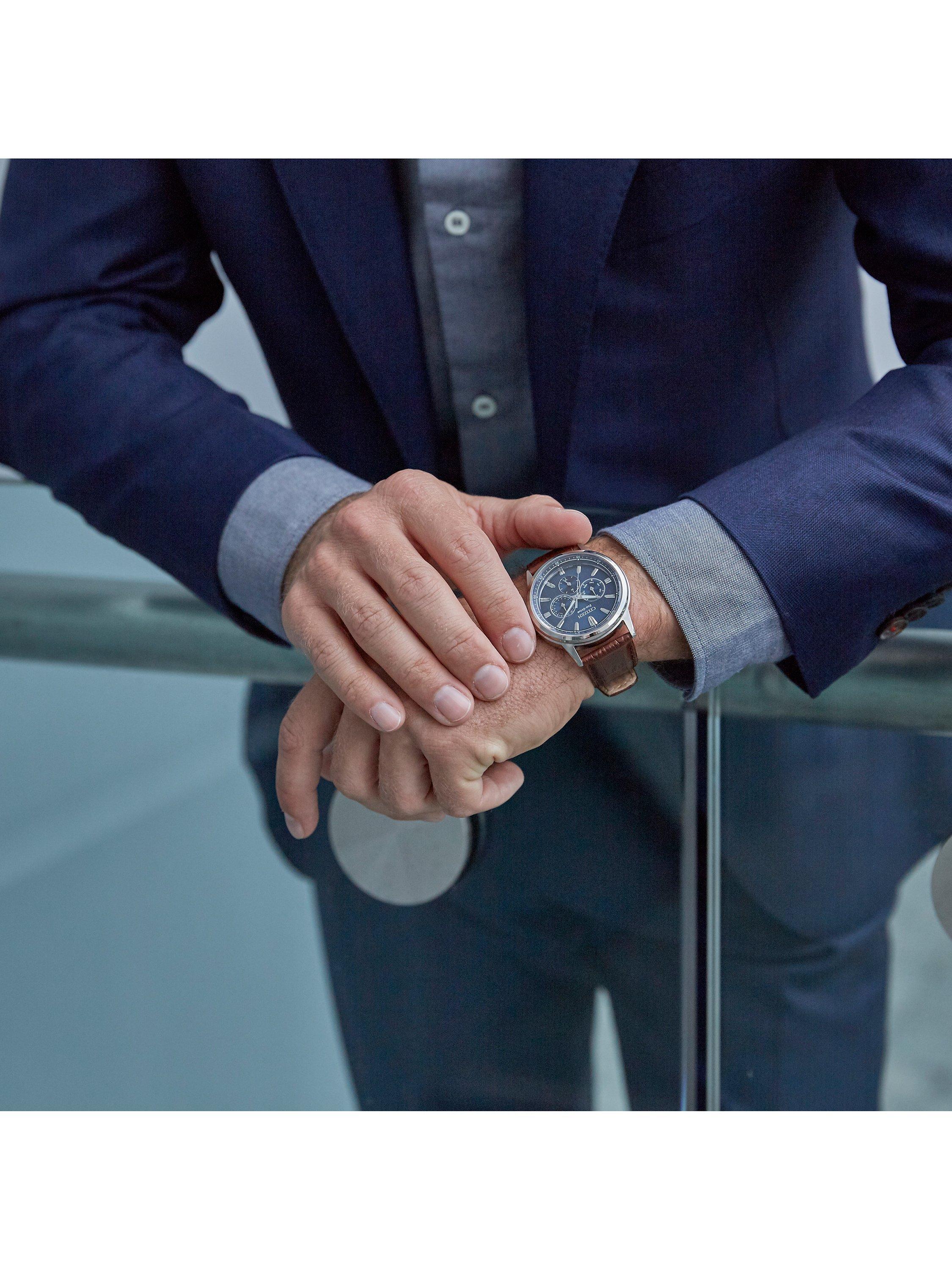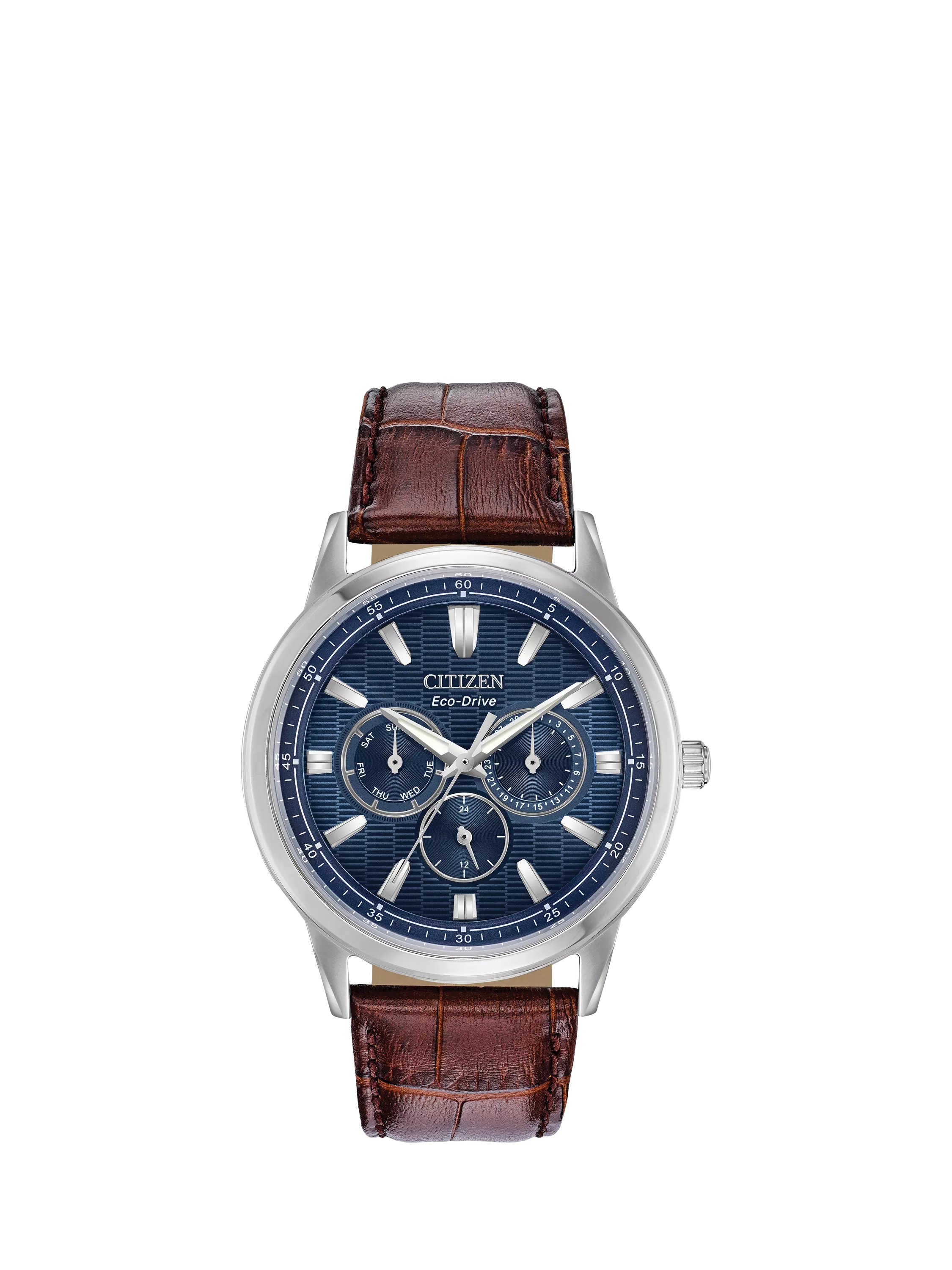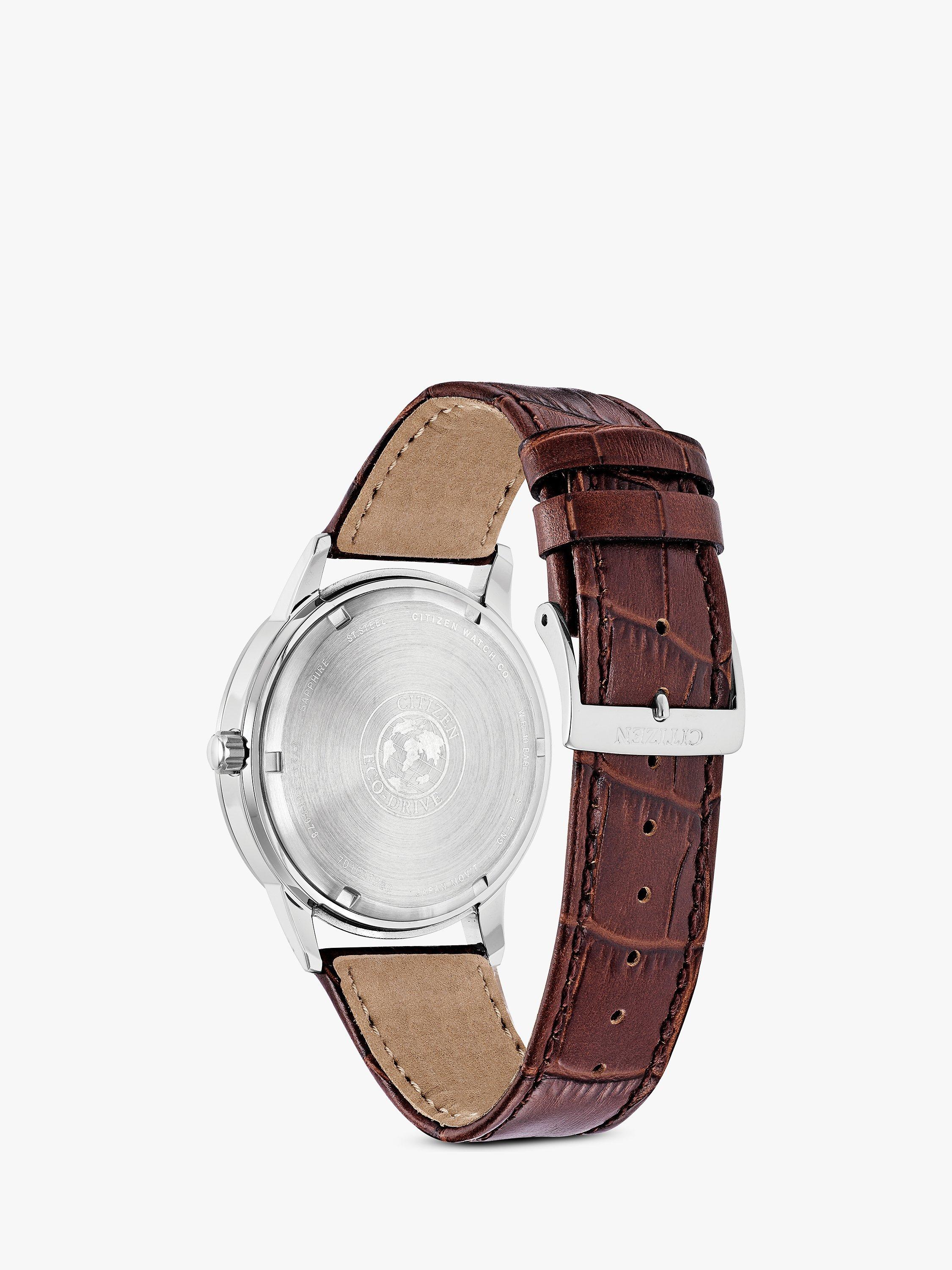 The Citizen Corso collection, a combination of functional simplicity with a touch of timeless elegance and powered by any light with Eco-Drive technology. This model features a stainless steel case and leather strap with a coloured dial, day/date display and 12/24-hour time.