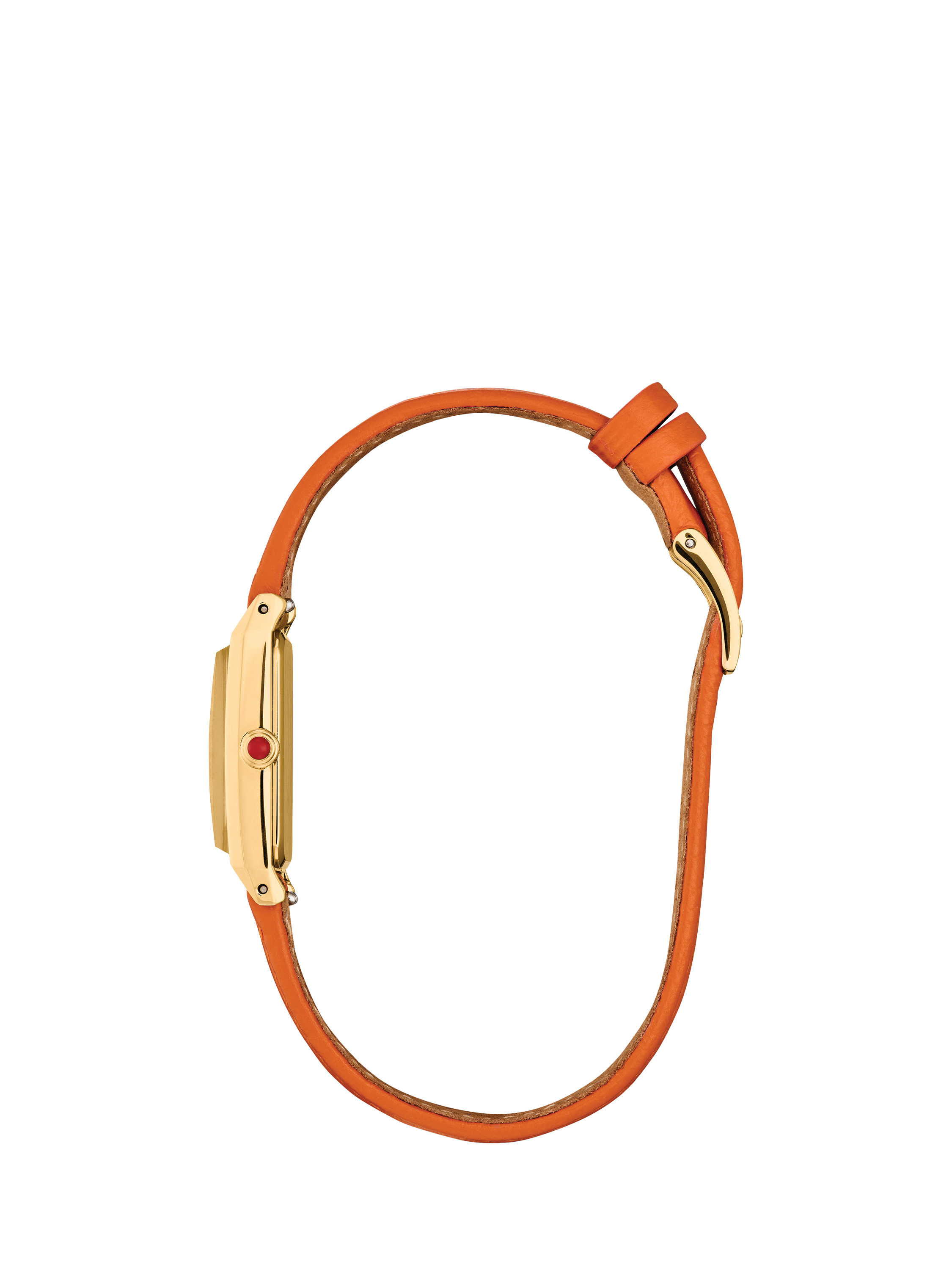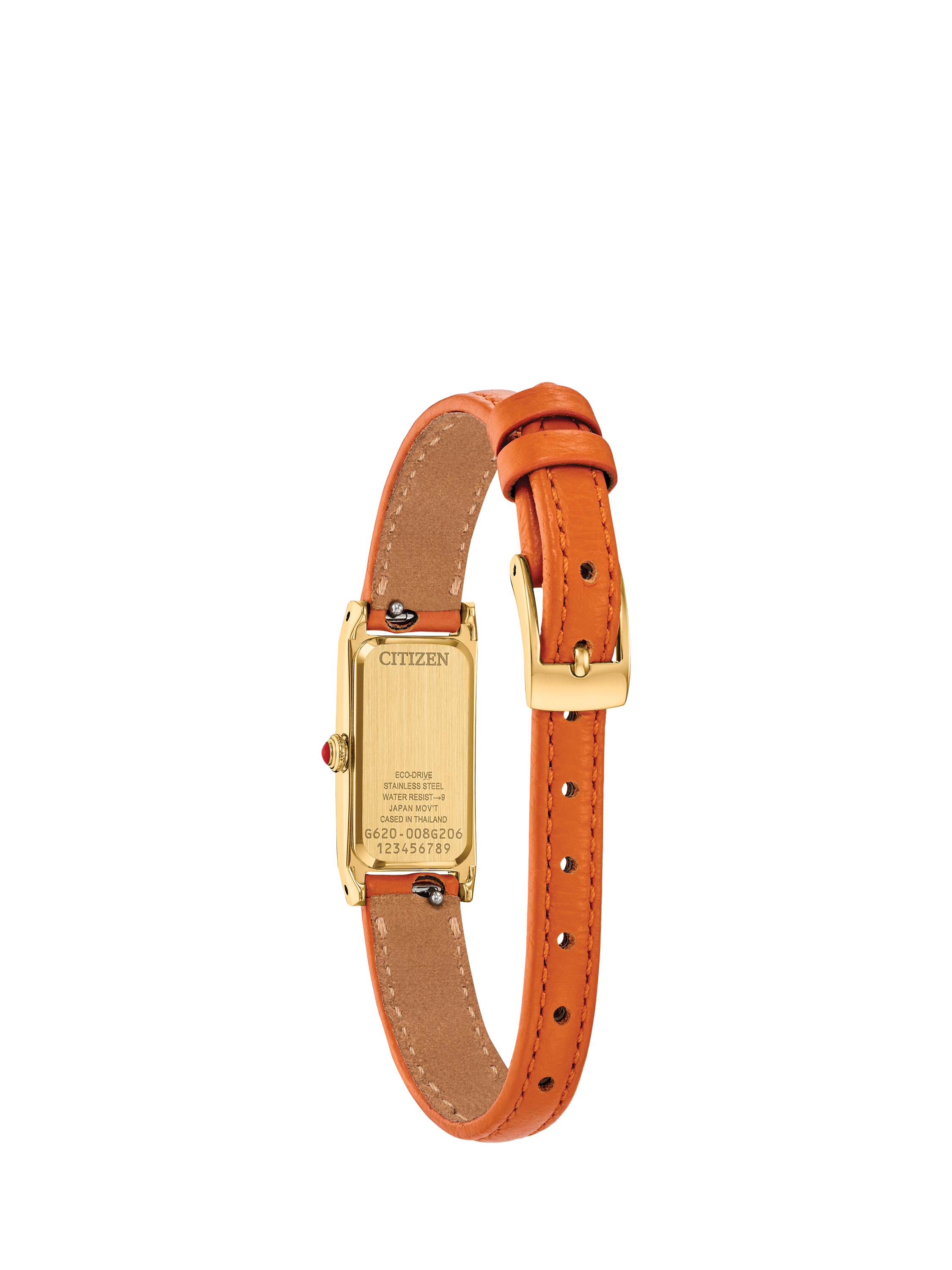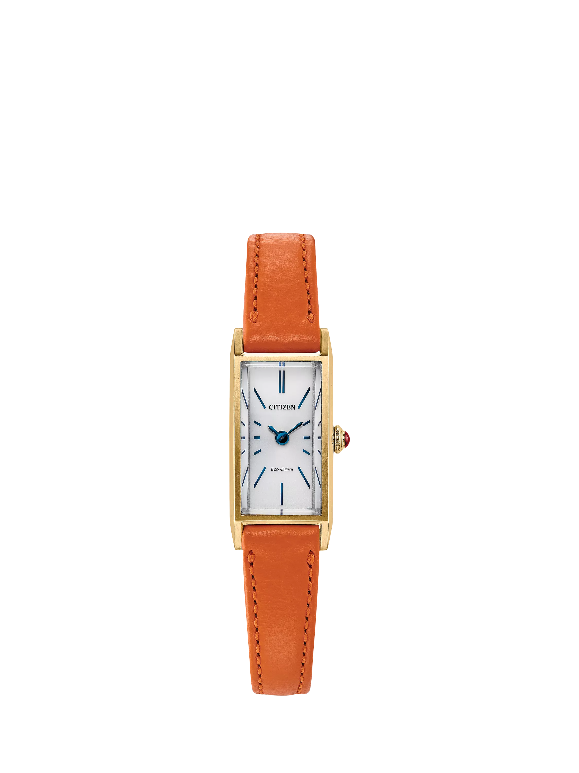 Add playful sophistication to your everyday look with the Fio. Designed with stylish sustainability in mind, this timepiece is powered by light – any light – with the brand's proprietary Eco-Drive technology and never needs a battery. Measuring 14.3 by 30.7mm, the elongated gold tone stainless steel case is set apart by angled lugs and a raised mineral crystal. An orange leather strap adds a pop of colour to the watch’s jewellery-like presence. On the silver-tone sunray dial, blue applied indices and slender sword-style hands offer striking contrast for effortless legibility. Water resistant up to 30 metres.