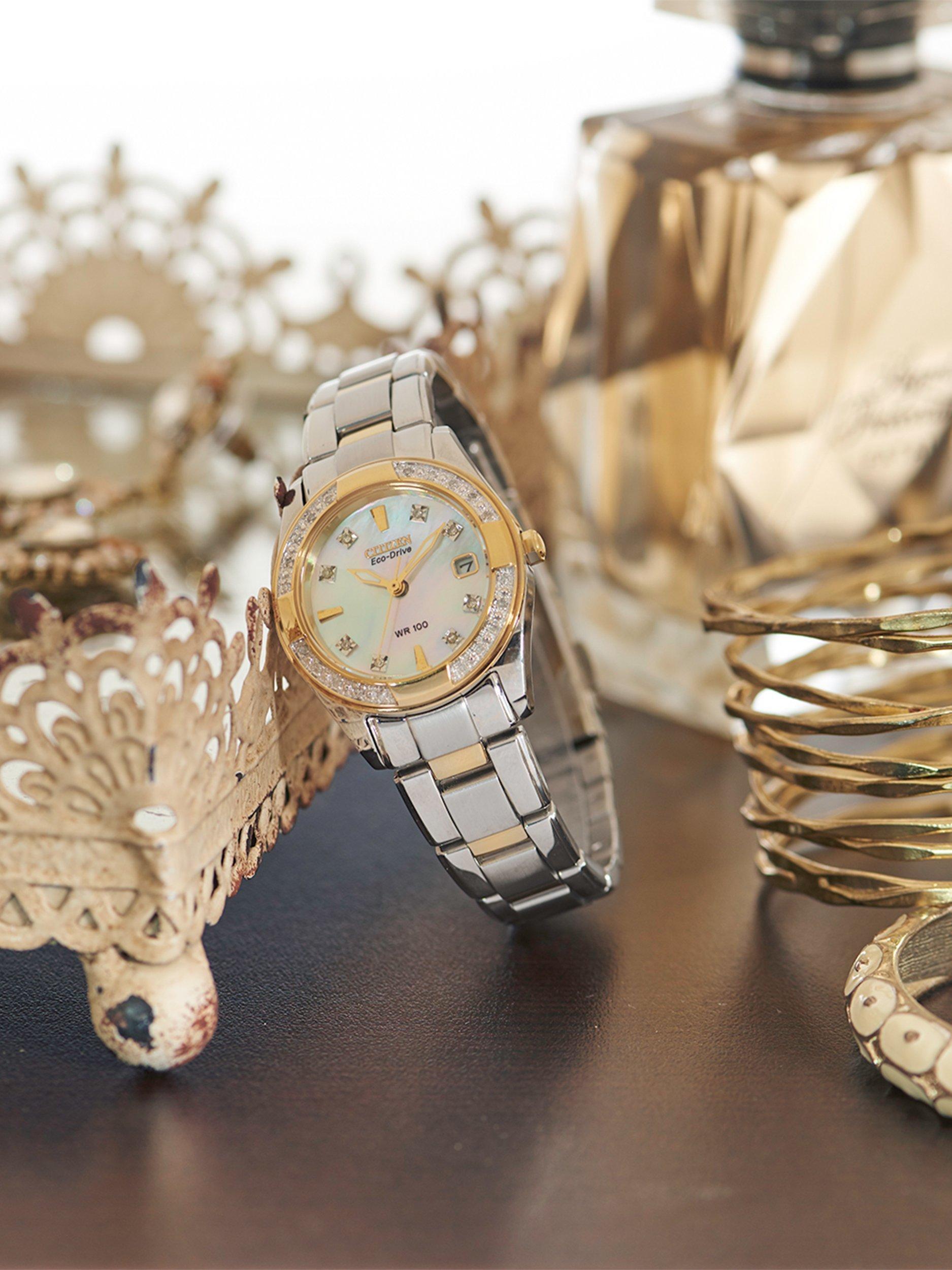 Regent’s majestic styling makes this a perfect choice for any occasion. This timepiece is enhanced with a Mother-of-Pearl dial highlighted with 8 diamonds and an additional 20 diamonds on the bezel. This 3 hand model also features date display, sapphire glass and water resistance to 100 metres. Citizen Eco-Drive technology means this watch is powered by light, any light. Never needs a battery.