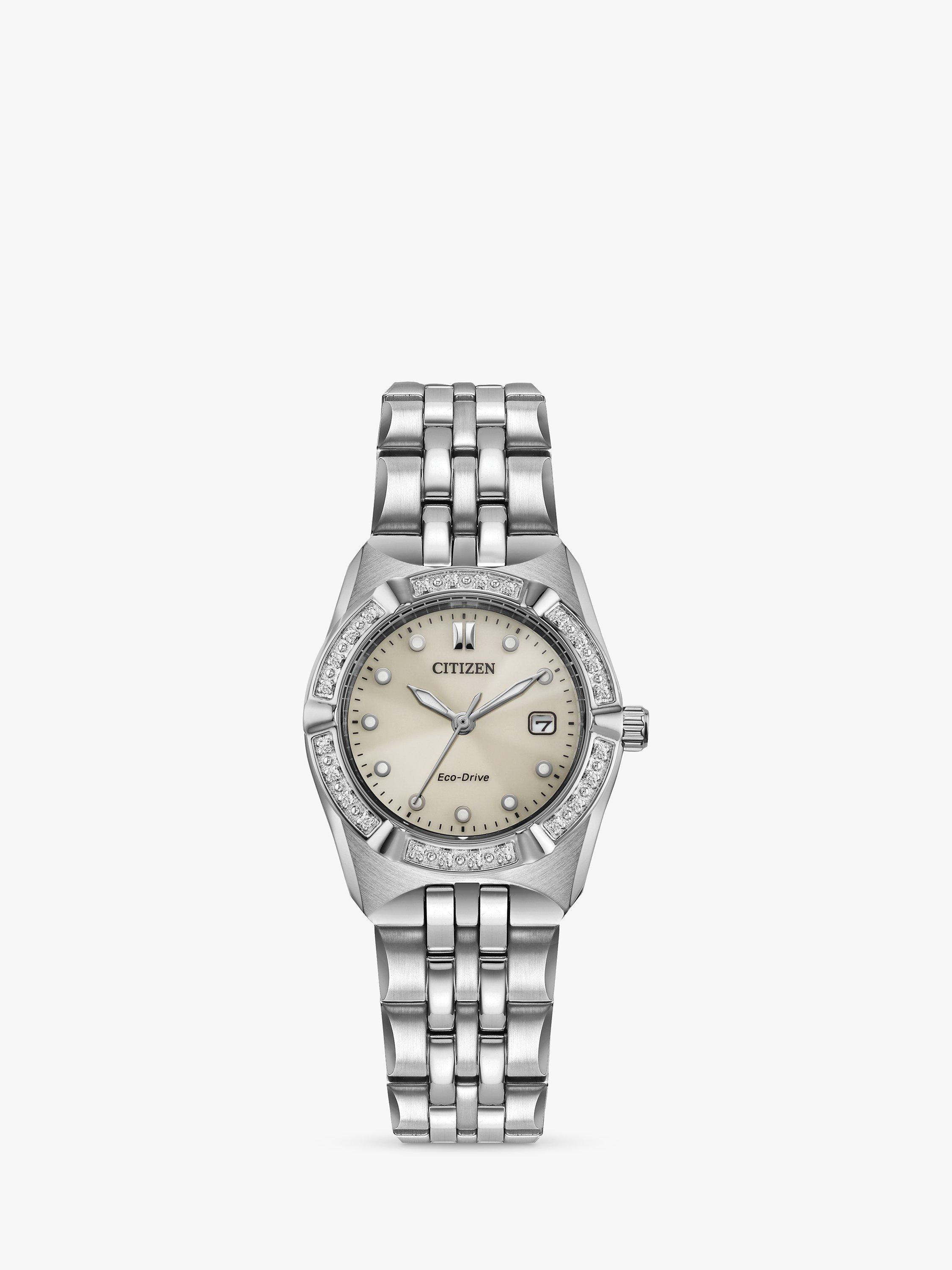 A classic timepiece that's always in style, the Corso women's watch from Citizen now features an added touch of sparkle. Featuring a diamond-accented bezel on a stainless steel 28mm case and matching bracelet, a three-hand dial with date indicator and luminous hands – this elegant timepiece also has a fold-over clasp closure with hidden push buttons and is water resistant to 100 metres. If you're looking for a dress watch to add elevated style to your wardrobe, look no further – the Corso is the perfect choice. Featuring Citizen’s Eco-Drive technology, so it is sustainably powered by any light and will never need a battery.