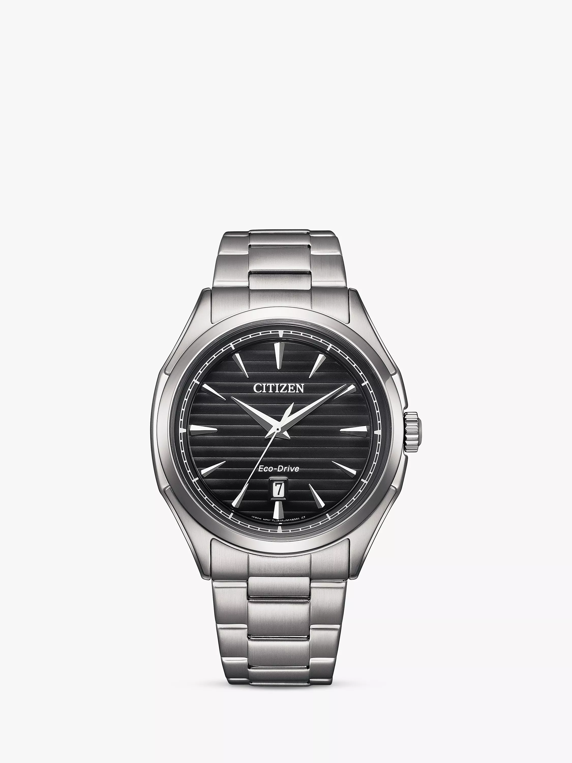 A modern twist on a timeless look, this Ring Solar timepiece from Citizen features a dial featuring a date window at the 6 o'clock position and completed with sleek hands and markers. A 41mm stainless steel case and bracelet makes this timepiece perfect for work, play and everything in between. Water resistance to 100 metres. Sustainably powered by Citizen Eco-Drive technology.