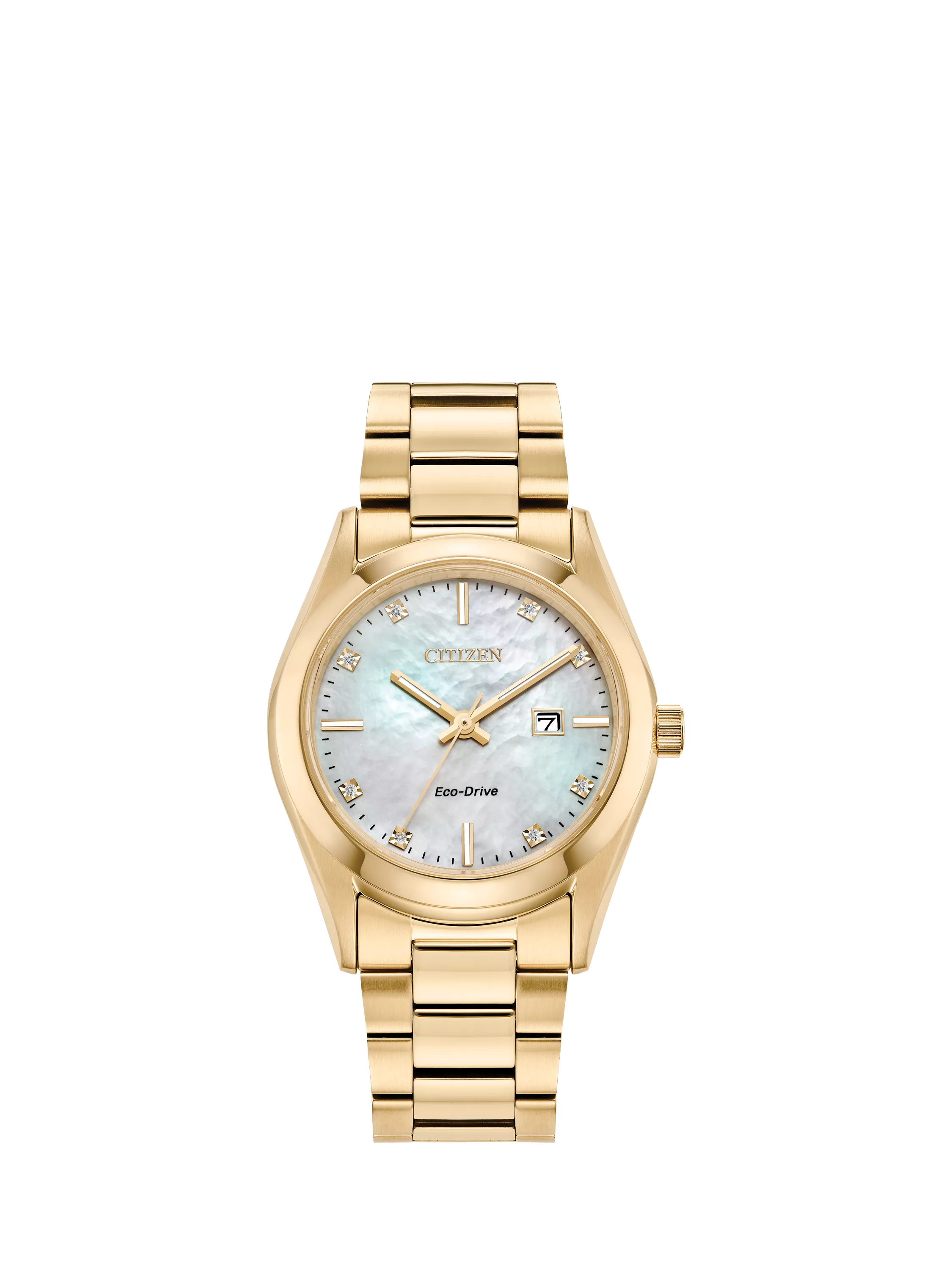 Elevate your daily looks with this timepiece from Citizen. Fusing wearability with feminine elegance, this timepiece is the ultimate day-to-evening watch to wear. The stainless steel case measures 33mm in diameter and is presented on a 3-link stainless steel bracelet for a sleek, versatile wear on the wrist. The dial features 8 diamond accents. With water resistance uto 100 metres and date display at the 3 o'clock position. Powered by Citizen’s proprietary Eco-Drive technology to provide light-powered vitality continuously and sustainably without ever needing a battery.