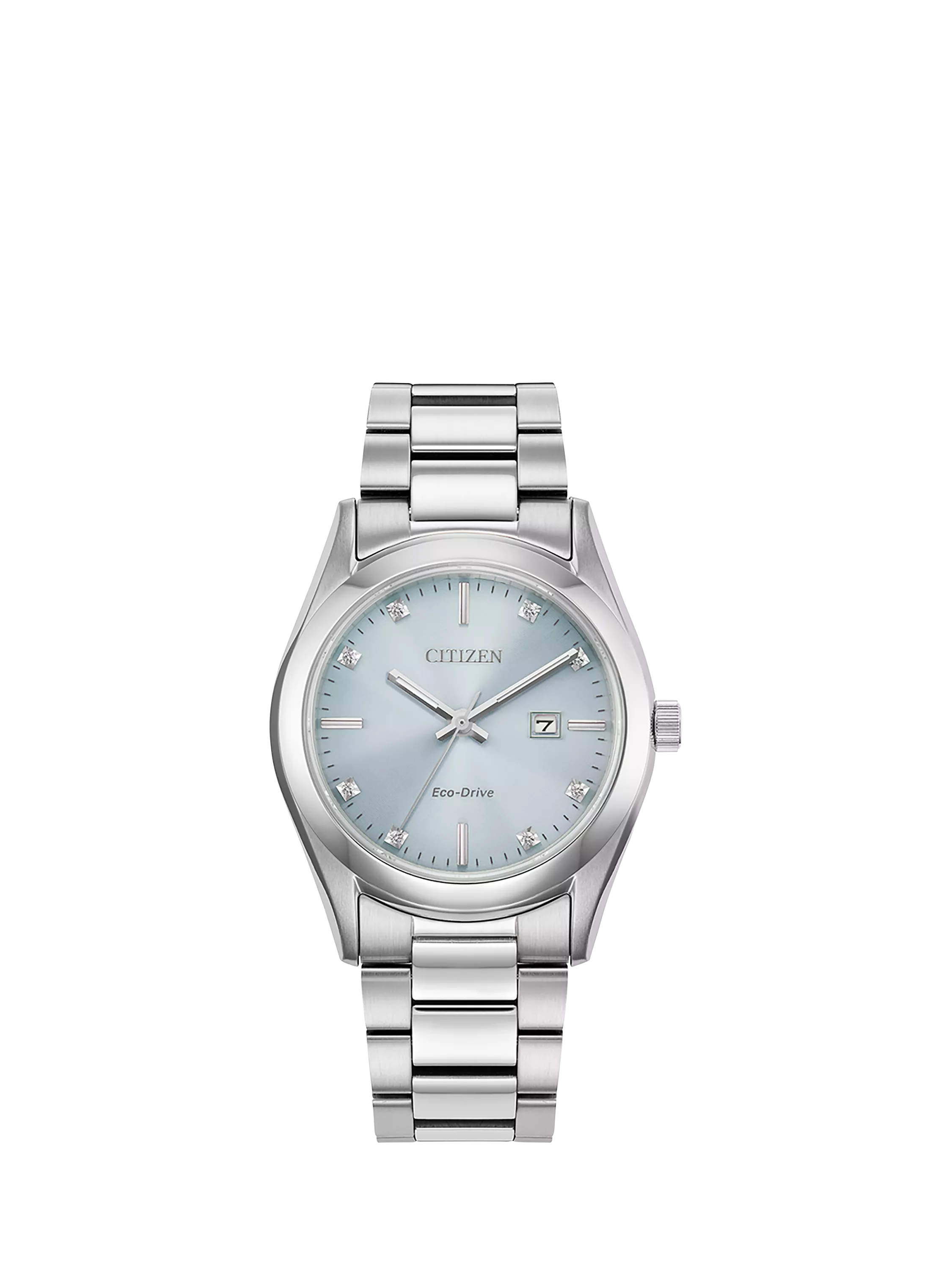 Elevate your daily looks with this timepiece from Citizen. Fusing wearability with feminine elegance, this timepiece is the ultimate day-to-evening watch to wear. The stainless steel case measures 33mm in diameter and is presented on a 3-link stainless steel bracelet for a sleek, versatile wear on the wrist. The dial features 8 diamond accents. With water resistance uto 100 metres and date display at the 3 o'clock position. Powered by Citizen’s proprietary Eco-Drive technology to provide light-powered vitality continuously and sustainably without ever needing a battery.
