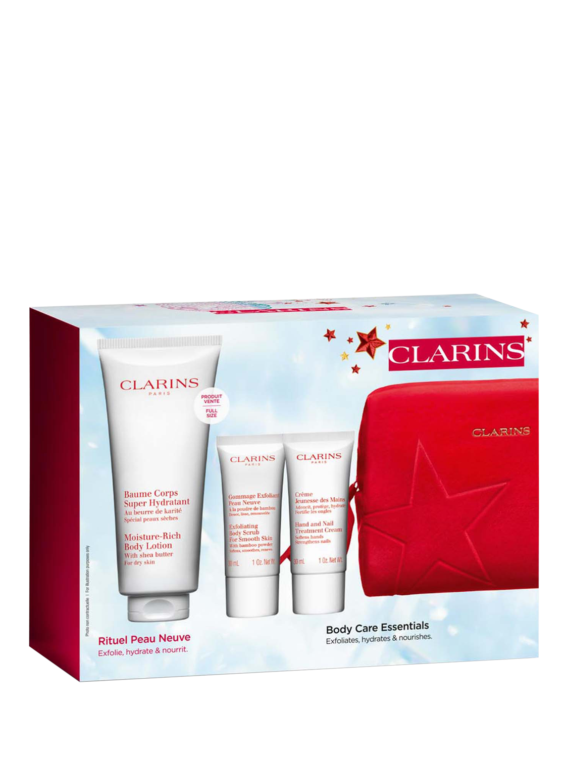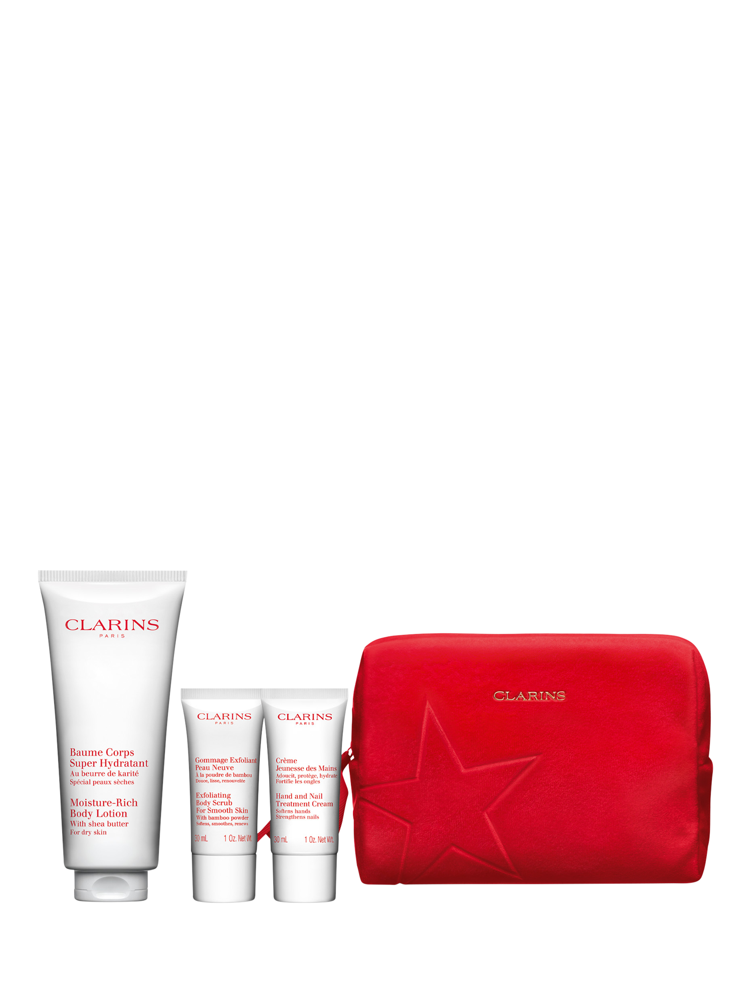 This set contains a full-size Moisture Rich Body Lotion, an Exfoliating Body Scrub and our Hand and Nail Treatment Cream, all presented in a beautiful wash bag. Give the gift of Clarins!