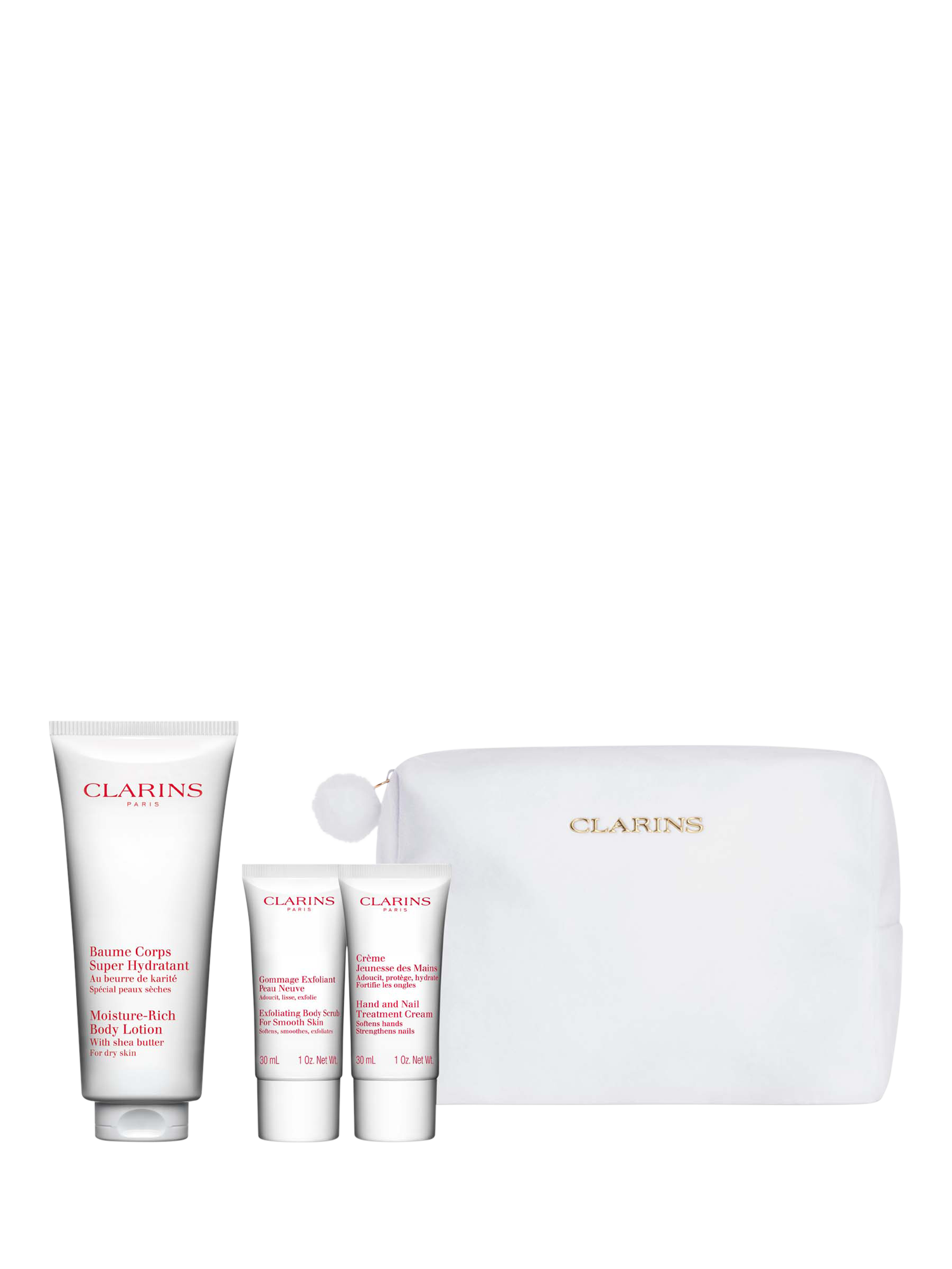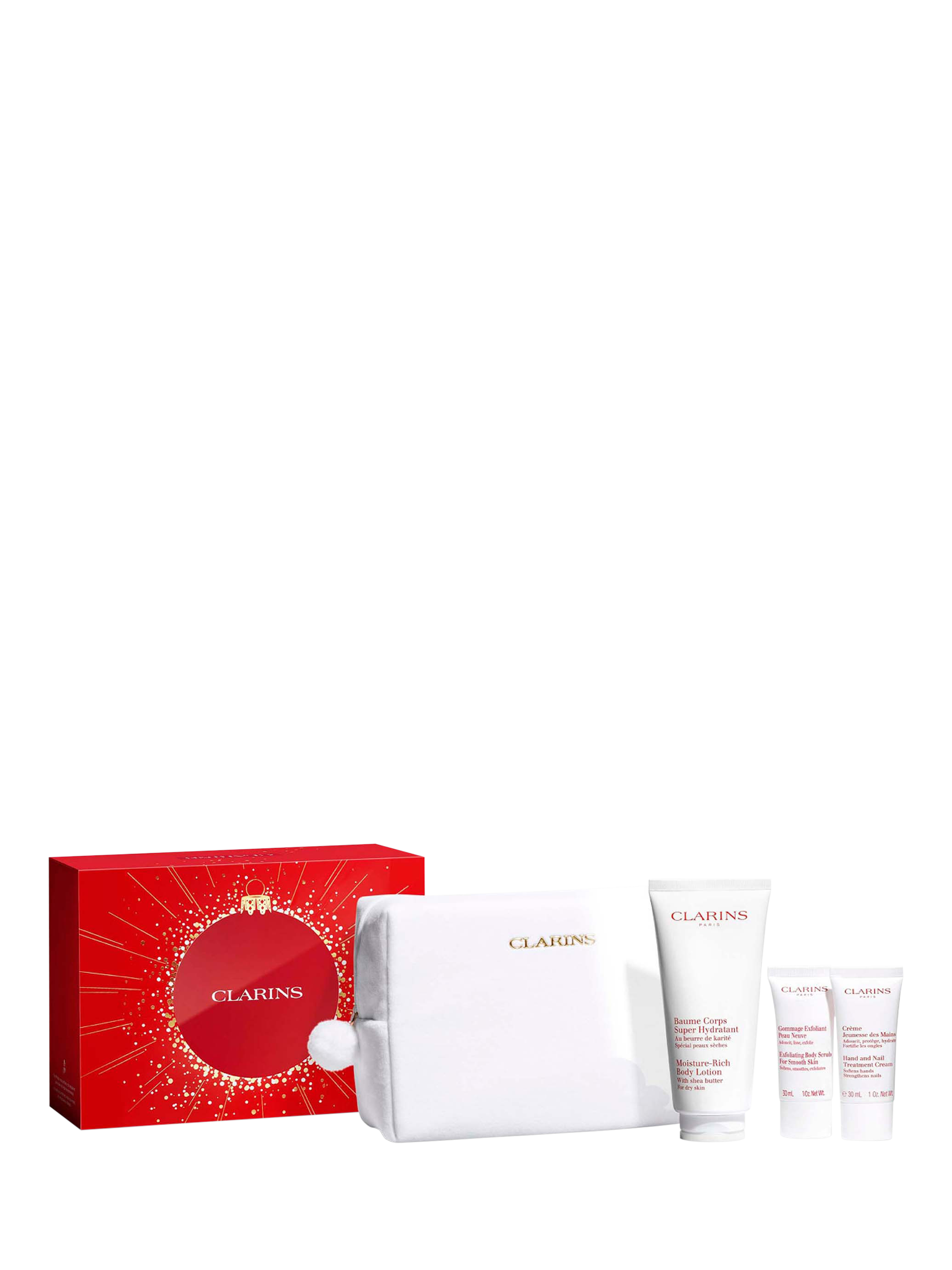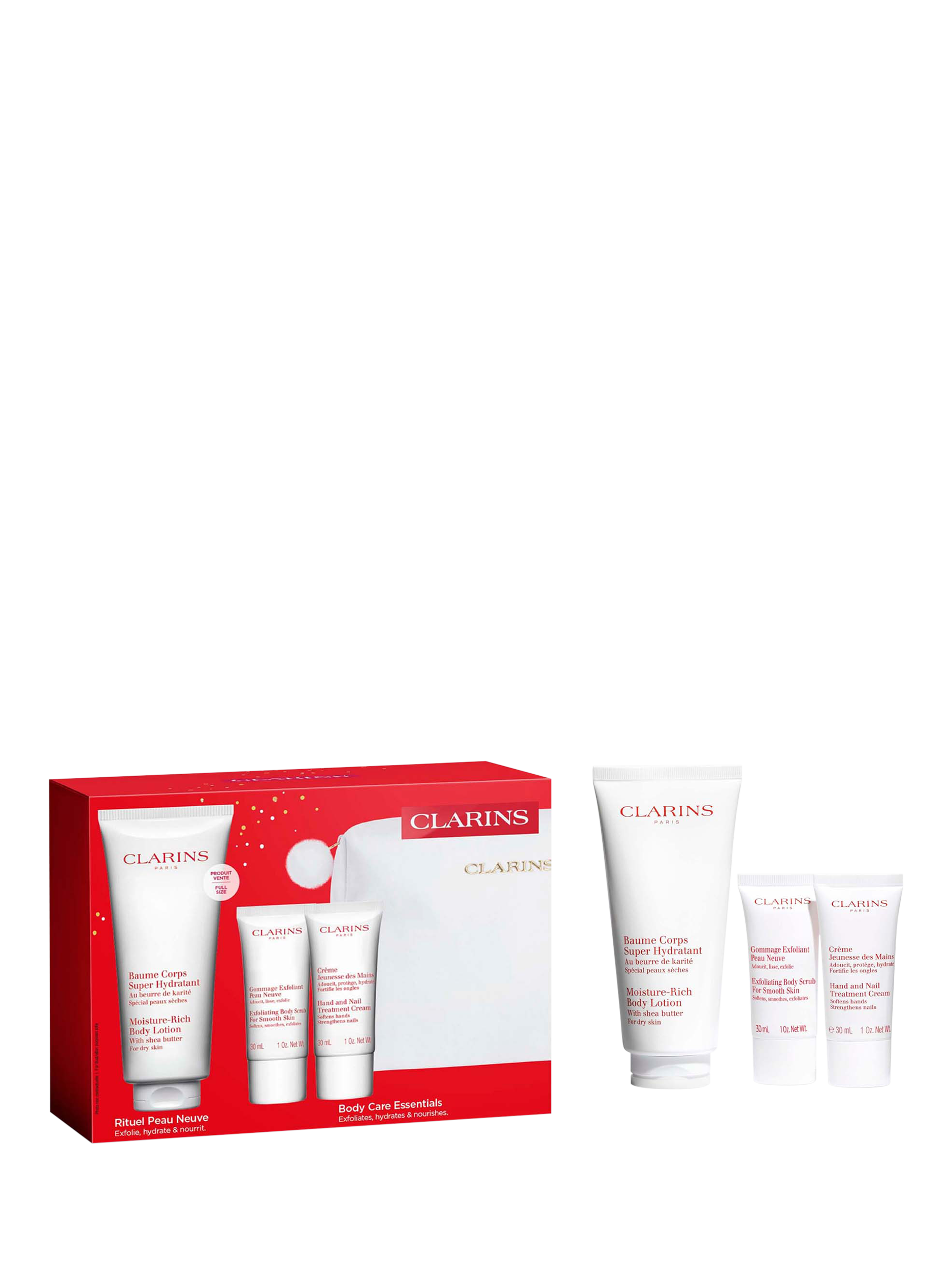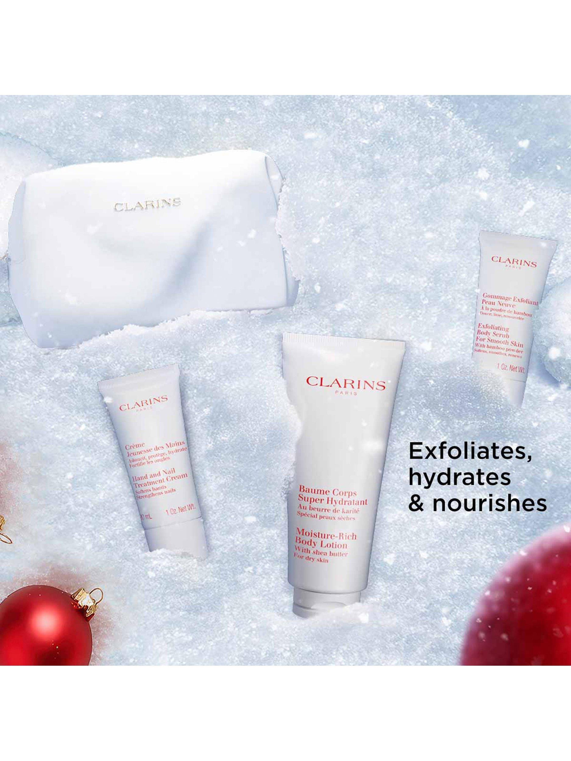 Glow all over with Clarins Body Care Essentials. This pampering set includes a full-size Moisture-Rich Body Lotion to deeply nourish and hydrate, Exfoliating Body Scrub to refine and smooth, and our cult favourite Hand & Nail Treatment Cream for soft, cared-for hands.