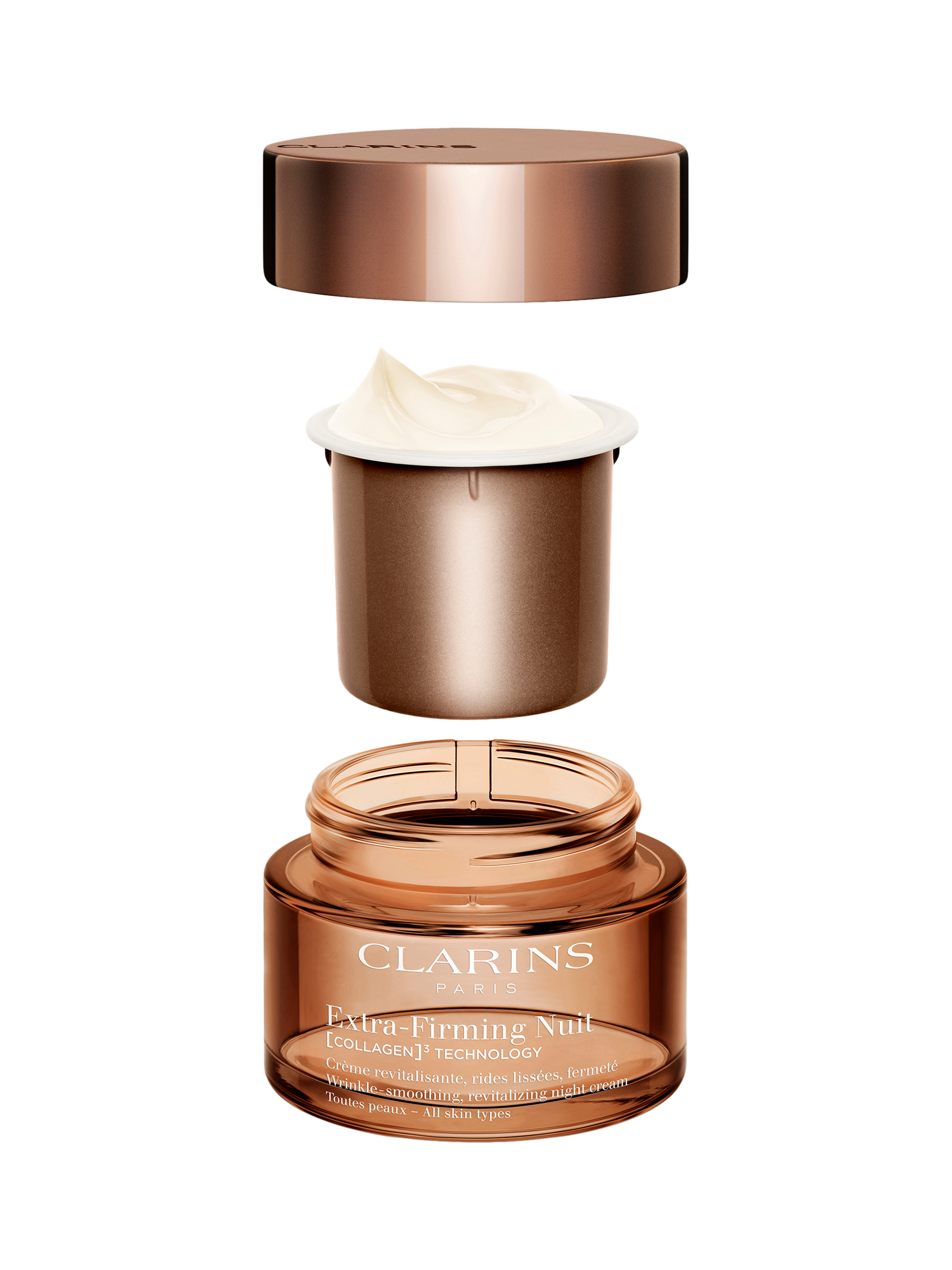A new-generation firming night cream. Our exclusive [COLLAGEN]³ TECHNOLOGY targets collagen thanks to its powerful trio of active ingredients.