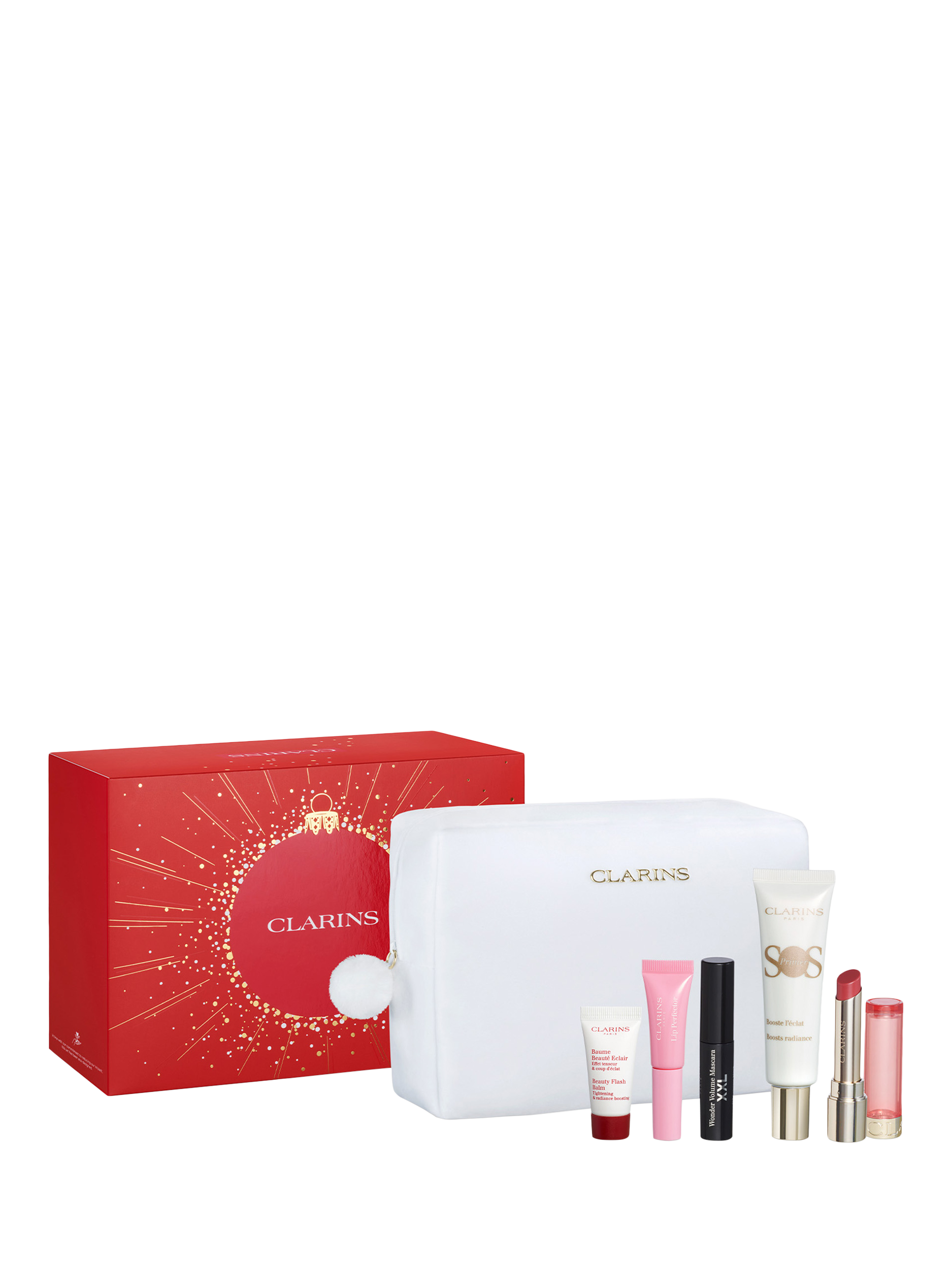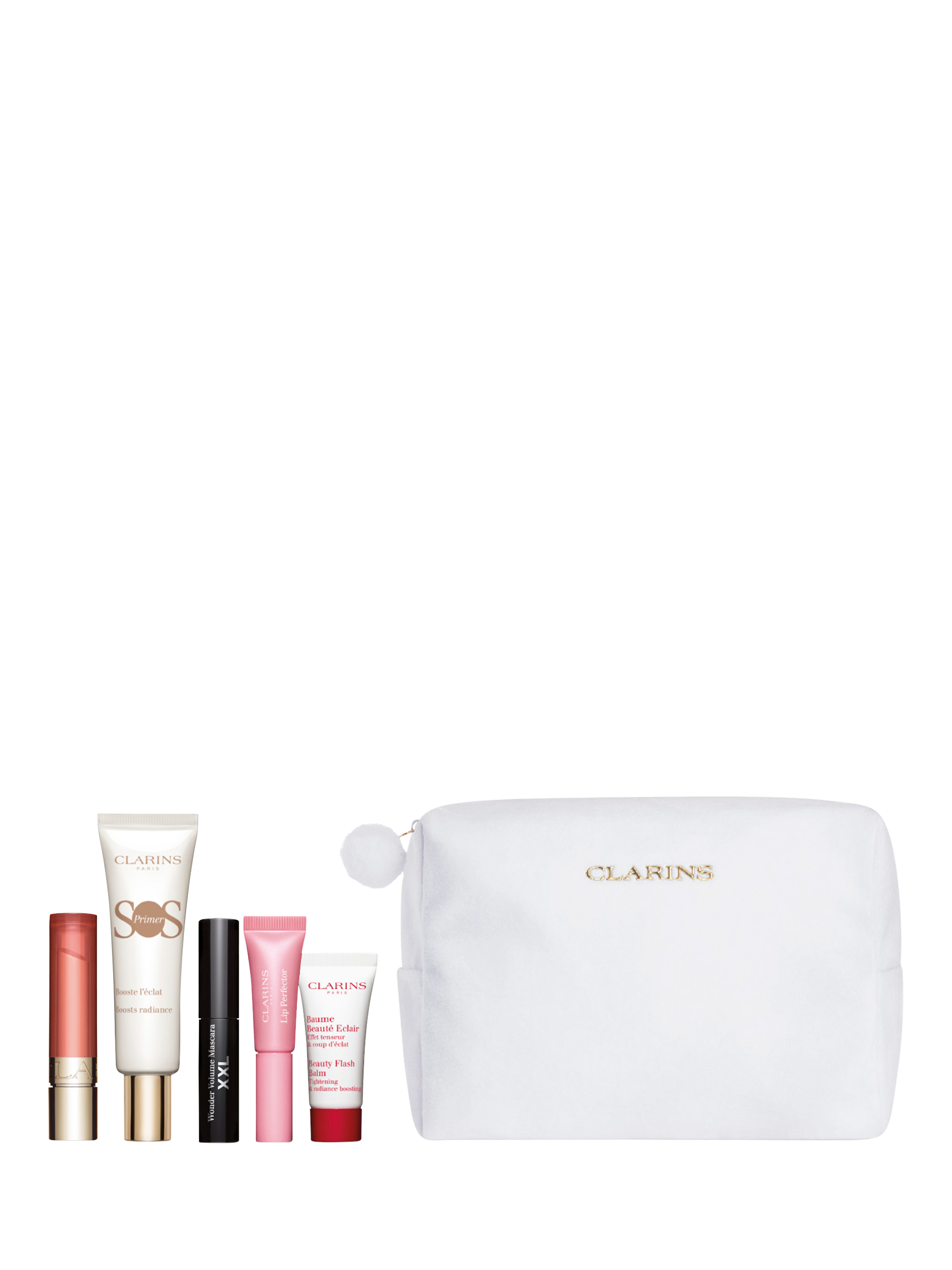 This glow-boosting set includes a full-size SOS Primer to prep and perfect your skin, full-size Lip Oil Balm 03 Lychee, XXL Mascara for hypnotic lashes, Lip Perfector 21 Soft Pink Glow and our complexion perfector, Beauty Flash Balm to restore radiance.