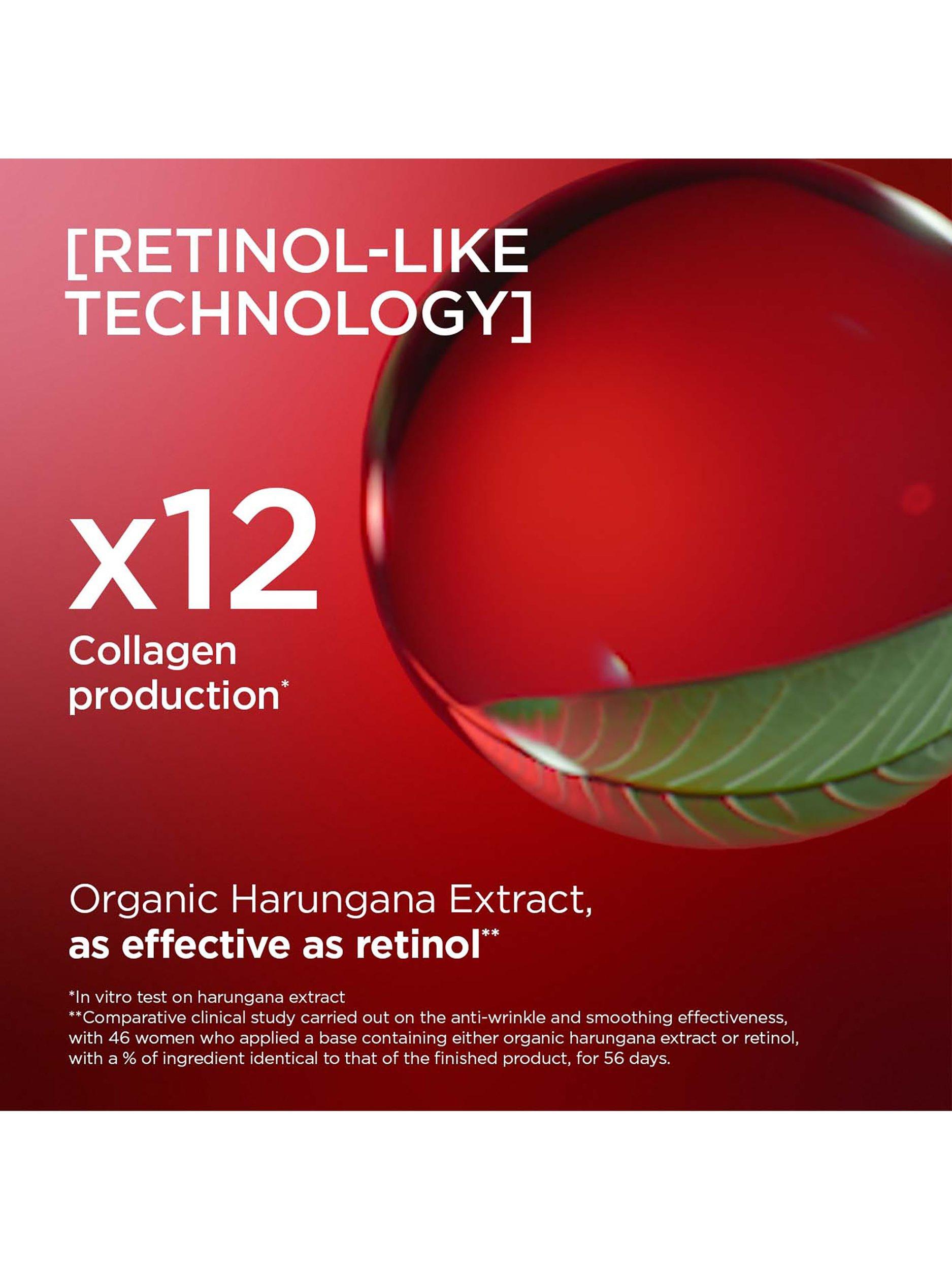 1 Comparative clinical study conducted on anti-wrinkle and smoothing effectiveness on 46 women applying a formula containing either organic harungana extract or retinol with the same % of ingredient as the finished product, over 56 days. 2 Two Clarins patents registered in France on the effectiveness of harungana extract. 3 In vitro test on harungana extract. 4 Instrumental test on silicone support. 5 The refill cannot be used on its own.