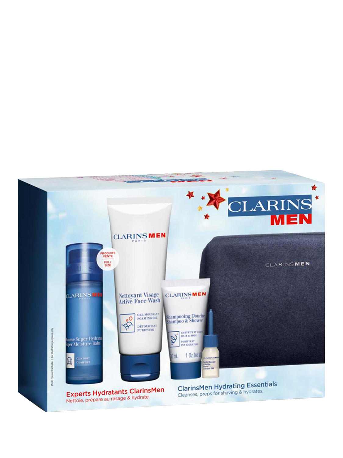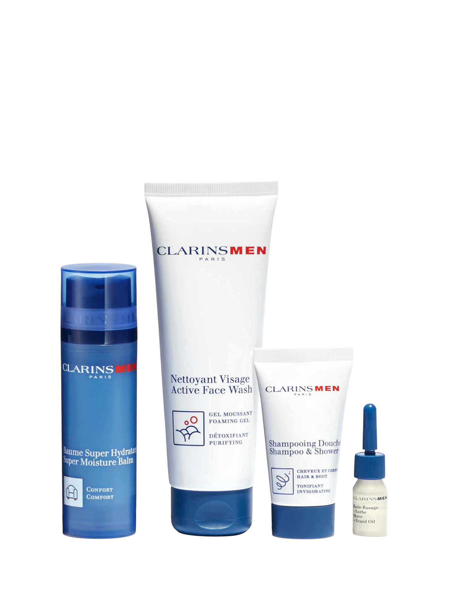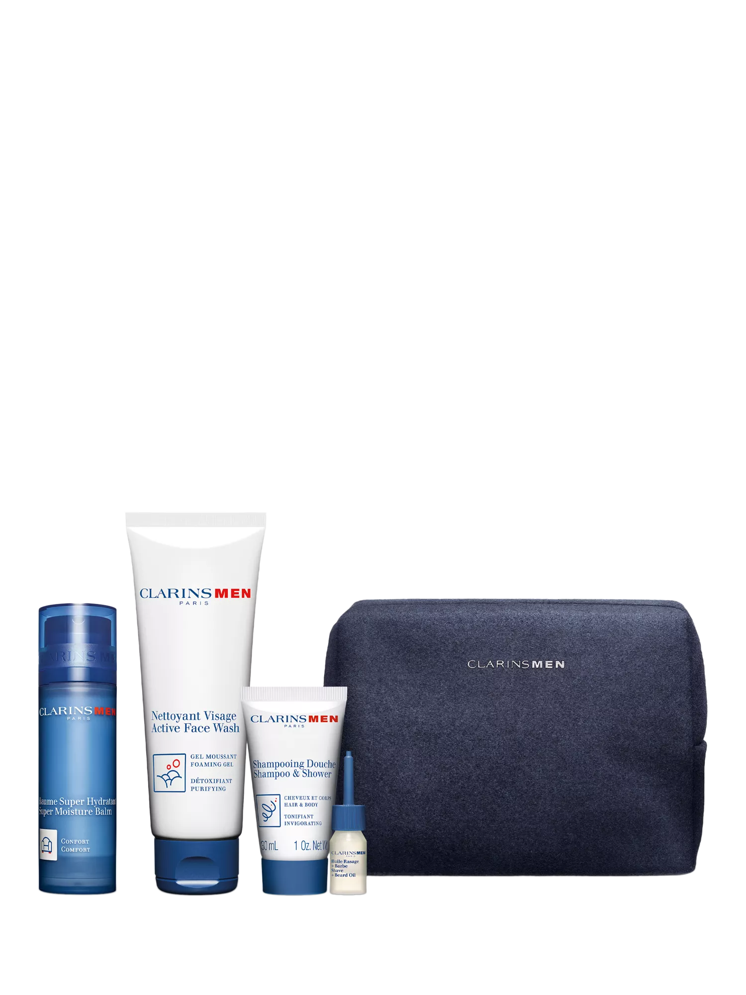 The perfect gift for any man! This collection includes a full-size ClarinsMen Super Moisture Balm 50ml, a full-size ClarinsMen Active Face Wash 125ml, ClarinsMen Shampoo & Shower 30ml, ClarinsMen Shave + Beard Oil 3ml and Double Serum Light sachets, all presented in a sleek wash bag. Get yours today!