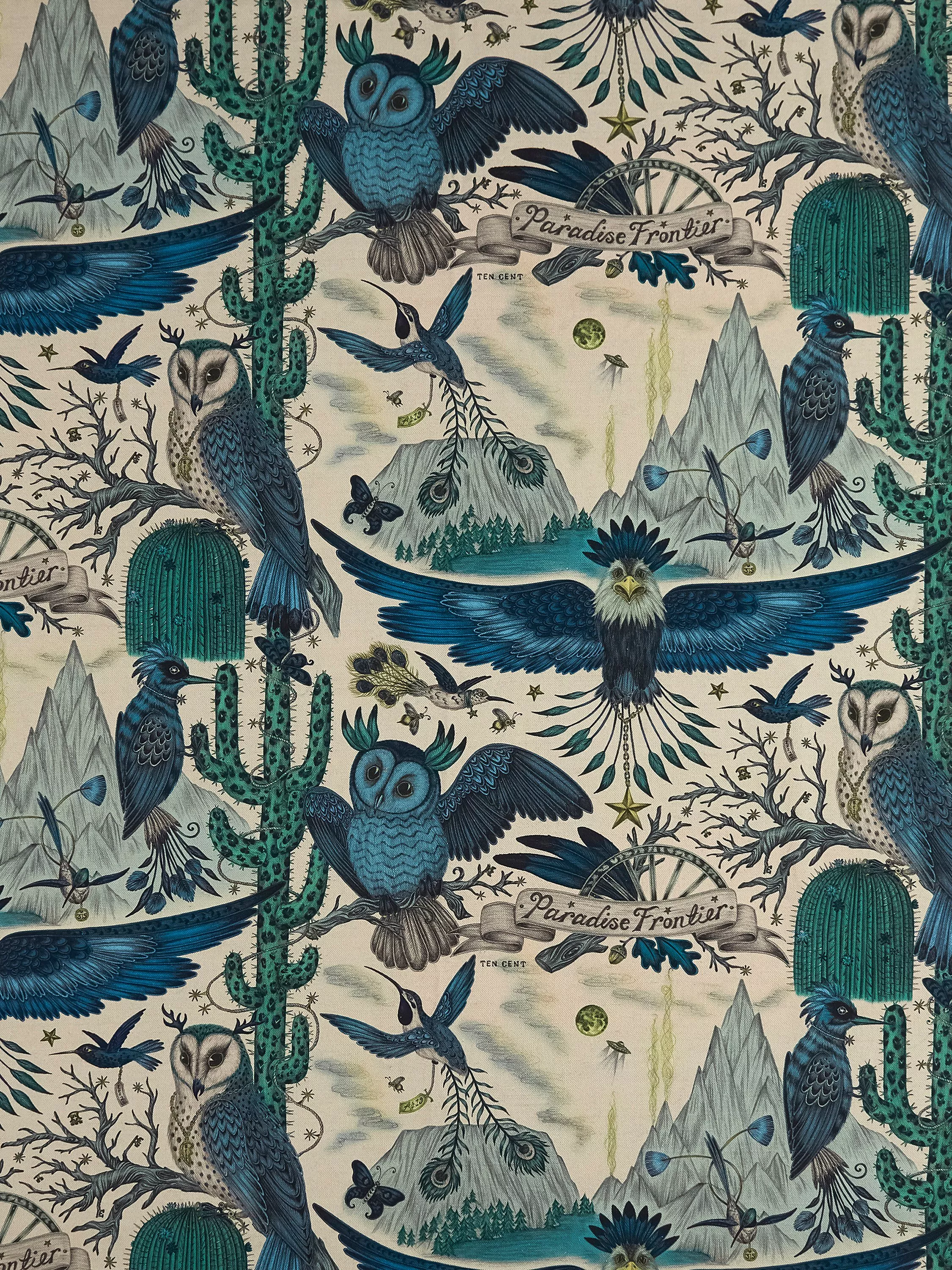 This fabric, Frontier, is part of the designer’s second collection for Clarke & Clarke which is a fantastical, nature-inspired series that travels from Africa to America via British fairy tales, always with a touch of surreal fantasy. This version is printed on a cotton/linen blend fabric, but it's also available as a velvet.