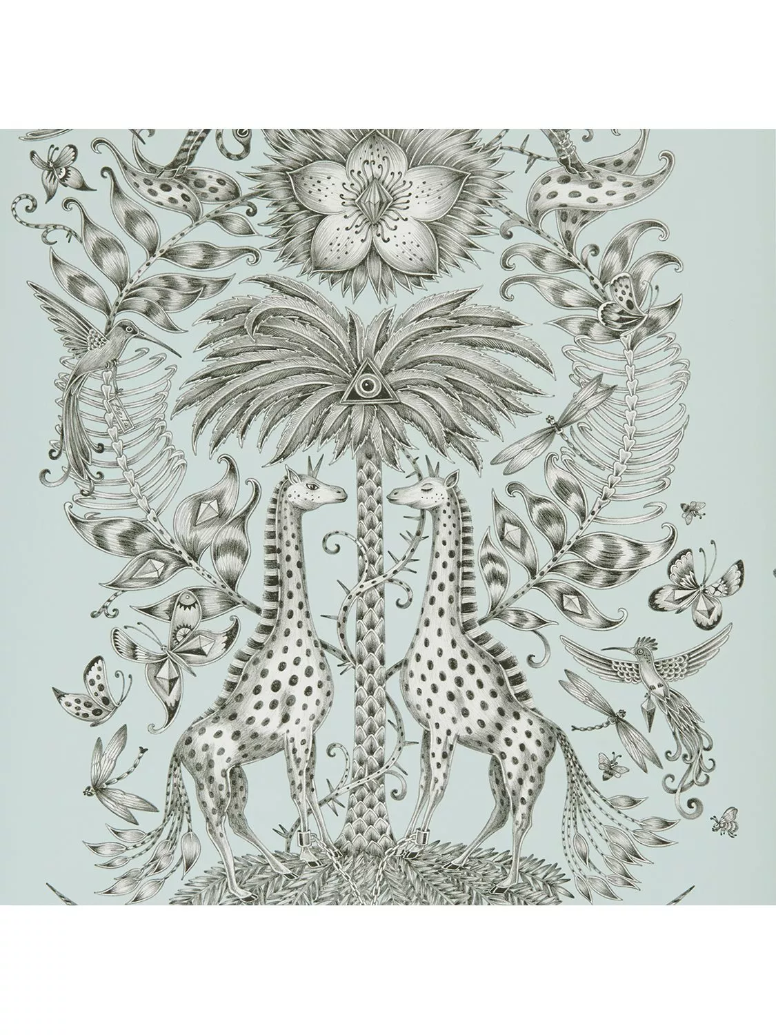 This striking design is inspired by a safari adventure and features a fantastical array of creatures and foliage including spotted giraffes and fantastical zebras.