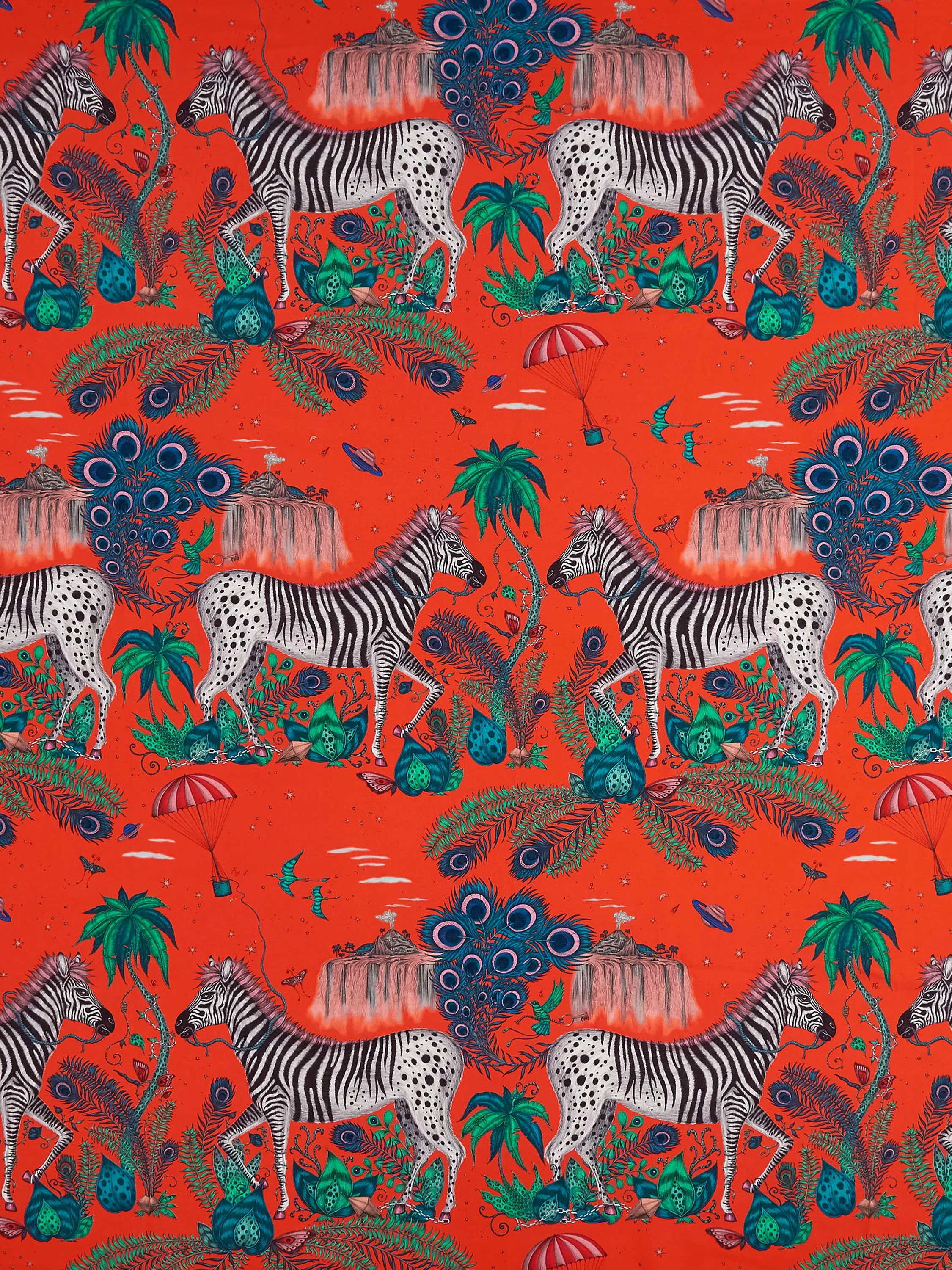 This fabric, Lost World, is part of the designer’s second collection for Clarke & Clarke which is a fantastical, nature-inspired series that travels from Africa to America via British fairy tales, always with a touch of surreal fantasy. This version has been printed on a pure cotton ground, but the design is also available on a cotton/linen blend and luxurious velvet as well.