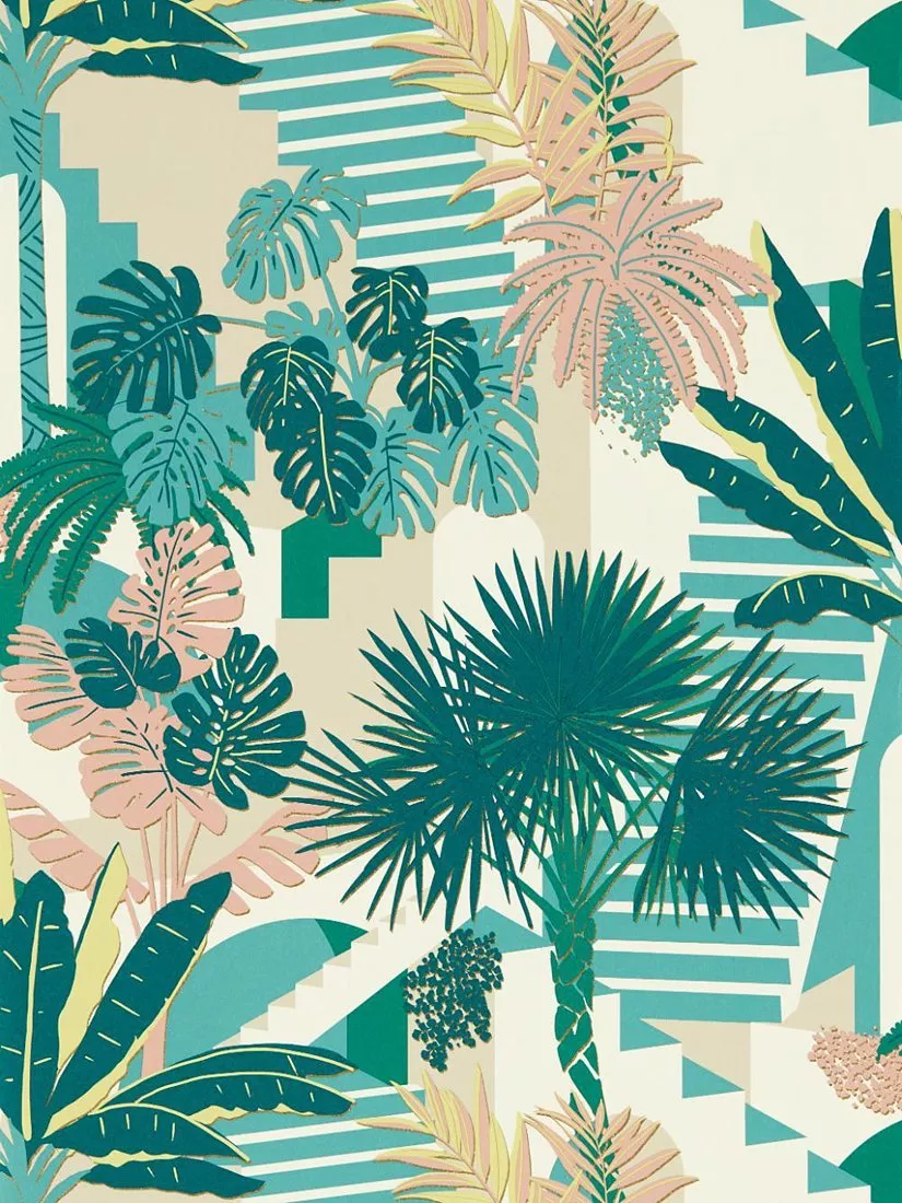 With its name meaning town/beach in Kenyan, Malindi takes the glamour and retro artistry of a coastal LA rooftop and accentuates its beauty with lush greenery. Contemporary tropical comfort and repose meets the abundant nature of palms with subtle metallic highlights in the shadow of shapes, giving this design a modern finish.