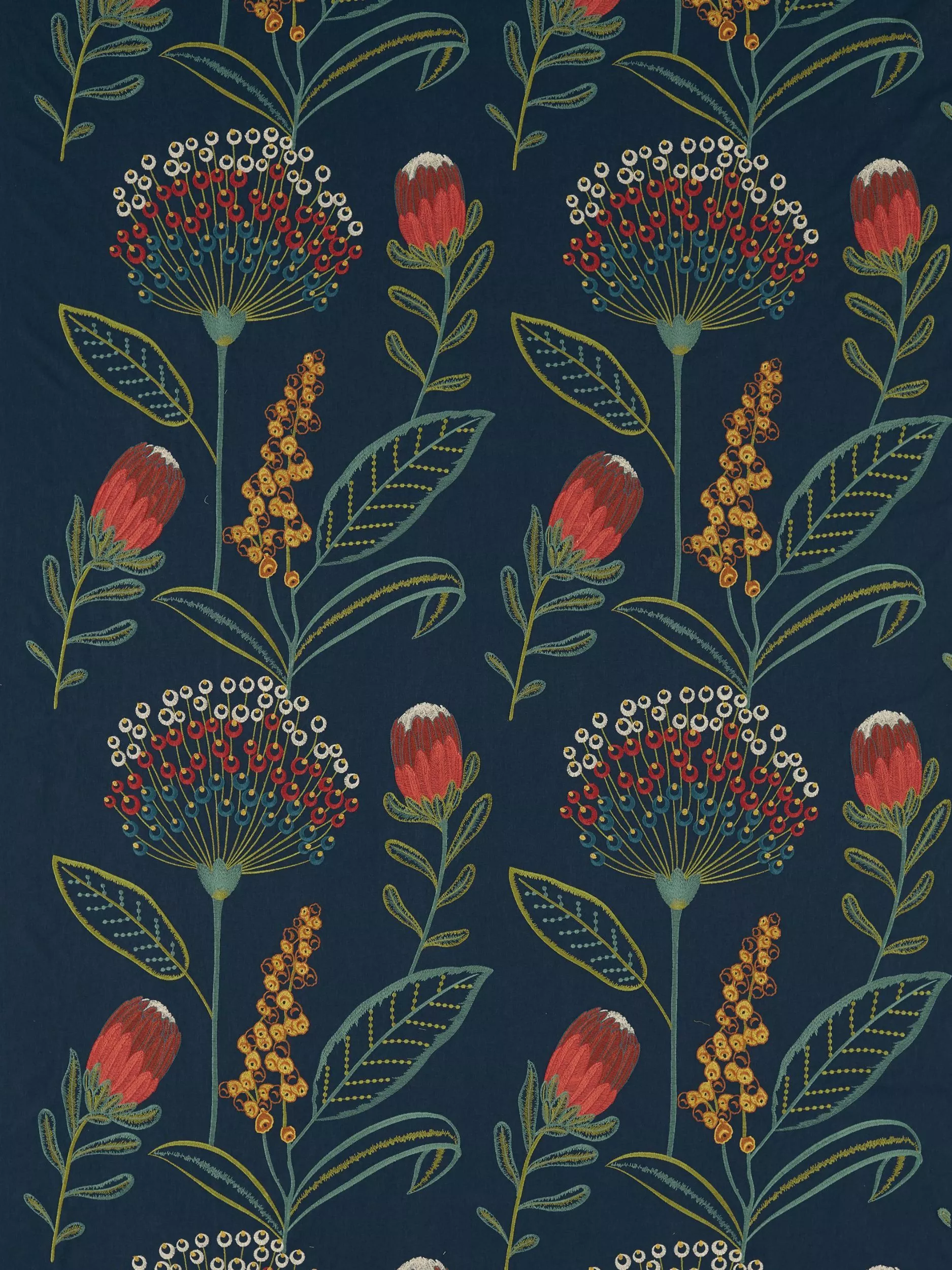 Showcasing embroidered florals and delicate greenery, Protini is a departure in style from the collection and yet works in beautiful harmony. Inspired by King Protea, the national flower of South Africa, and embroidered onto a polycotton base for ease of texture, Protini delights in the refreshing aspects of nature's splendour, perfect in any modern interior setting.