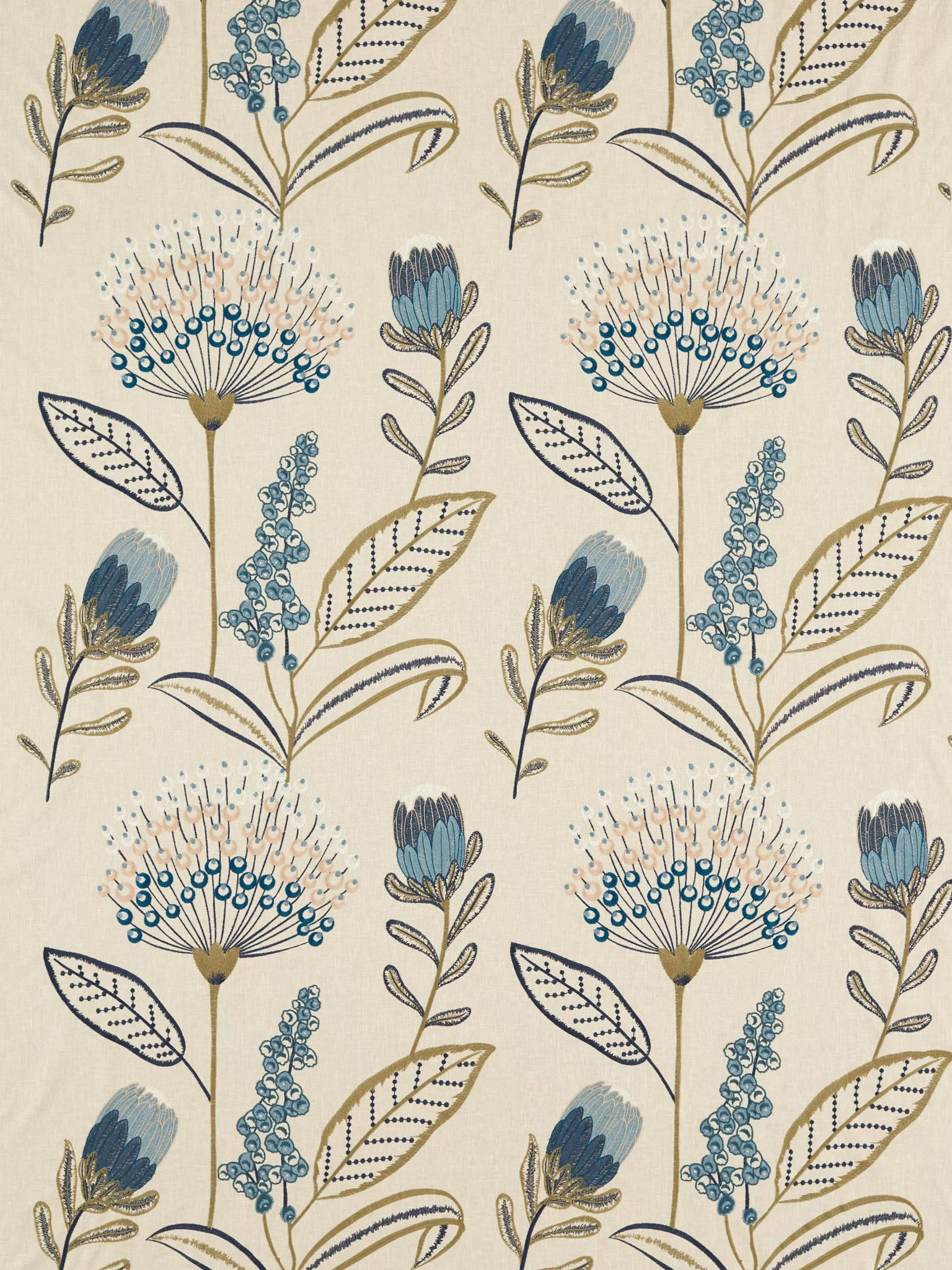 Showcasing embroidered florals and delicate greenery, Protini is a departure in style from the collection and yet works in beautiful harmony. Inspired by King Protea, the national flower of South Africa, and embroidered onto a polycotton base for ease of texture, Protini delights in the refreshing aspects of nature's splendour, perfect in any modern interior setting.