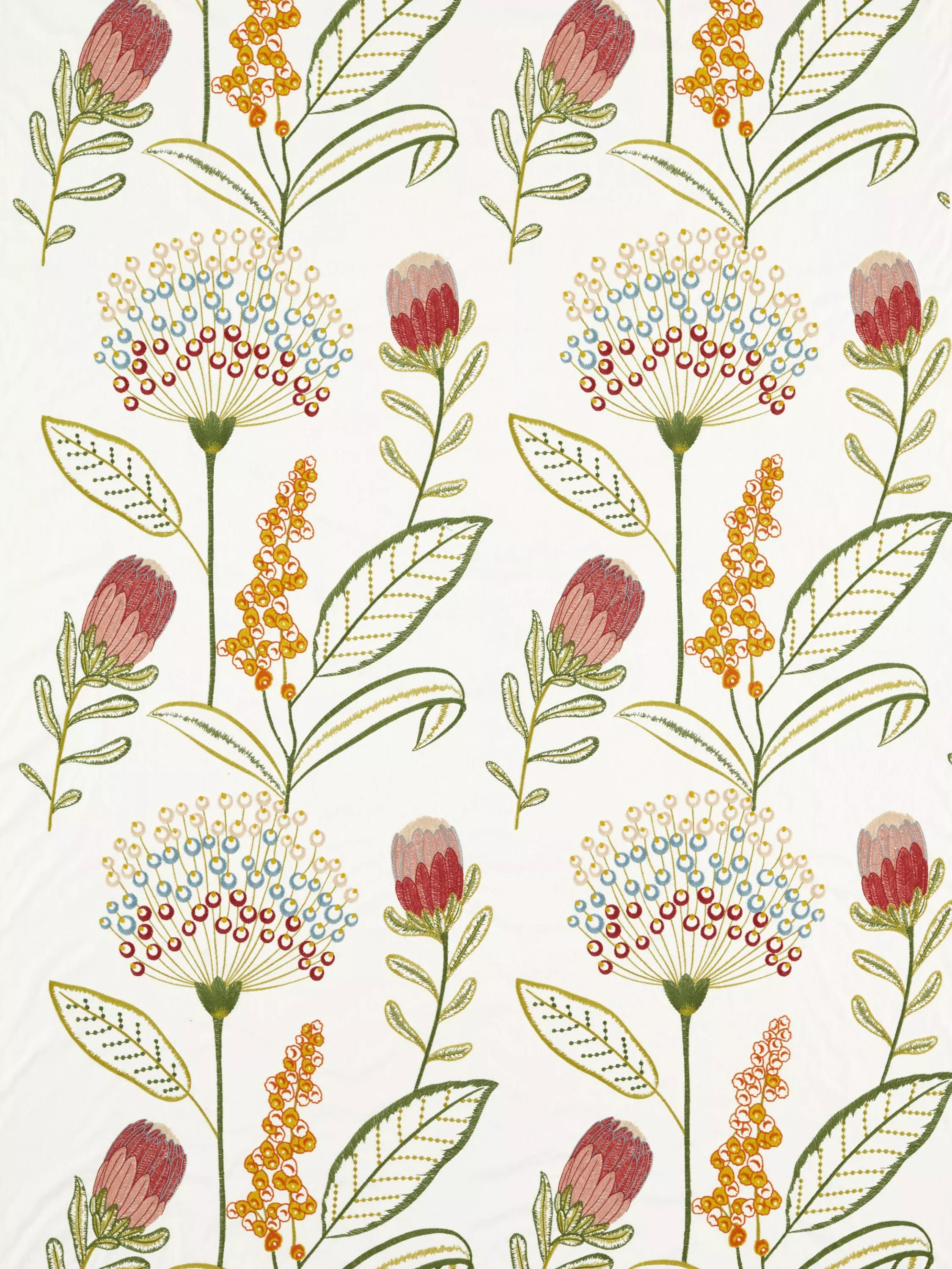Showcasing embroidered florals and delicate greenery, Protini is a departure in style from the collection and yet works in beautiful harmony. Inspired by King Protea, the national flower of South Africa, and embroidered onto a polycotton base for ease of texture, Protini delights in the refreshing aspects of nature's splendour, perfect in any modern interior setting.