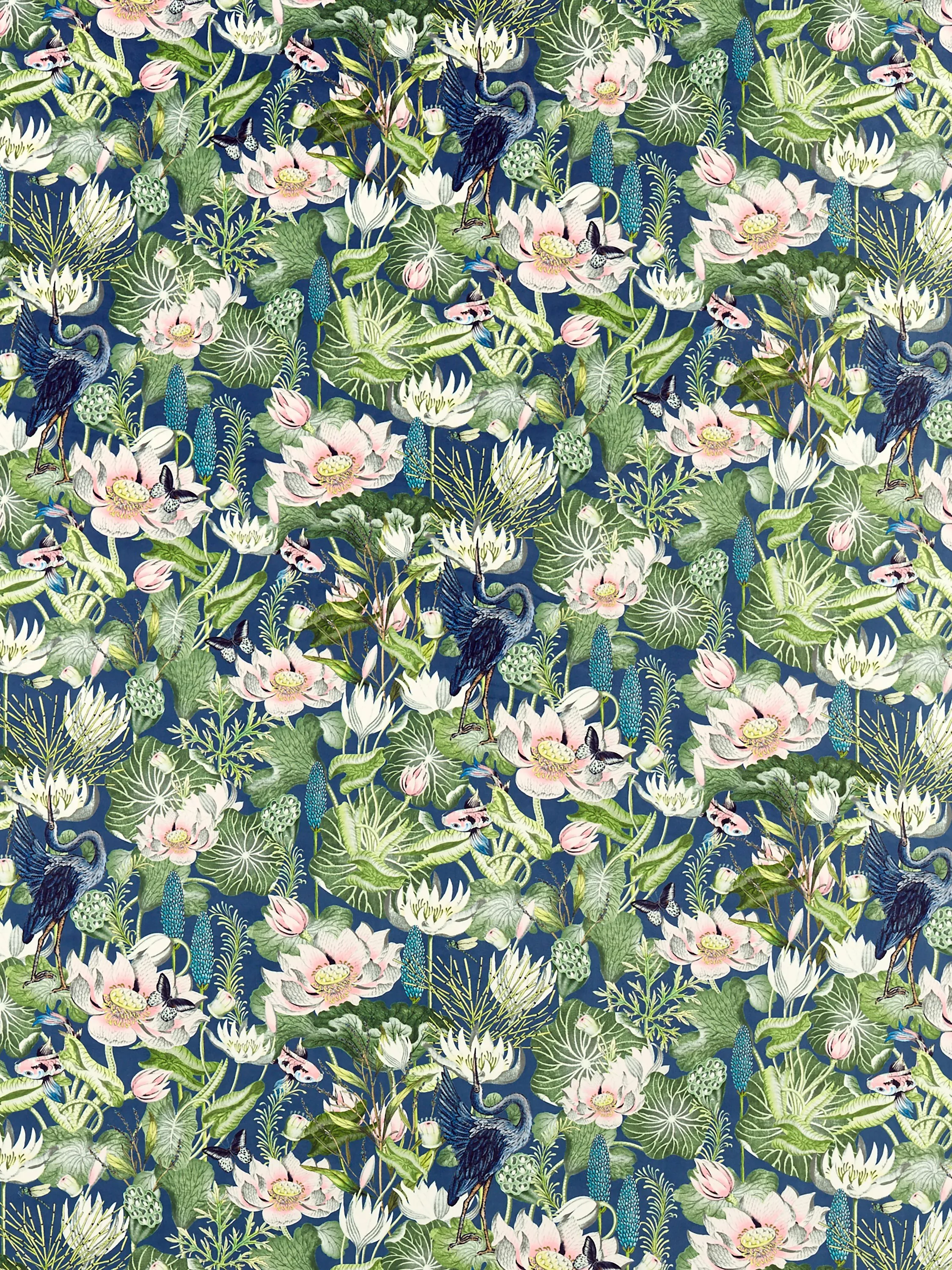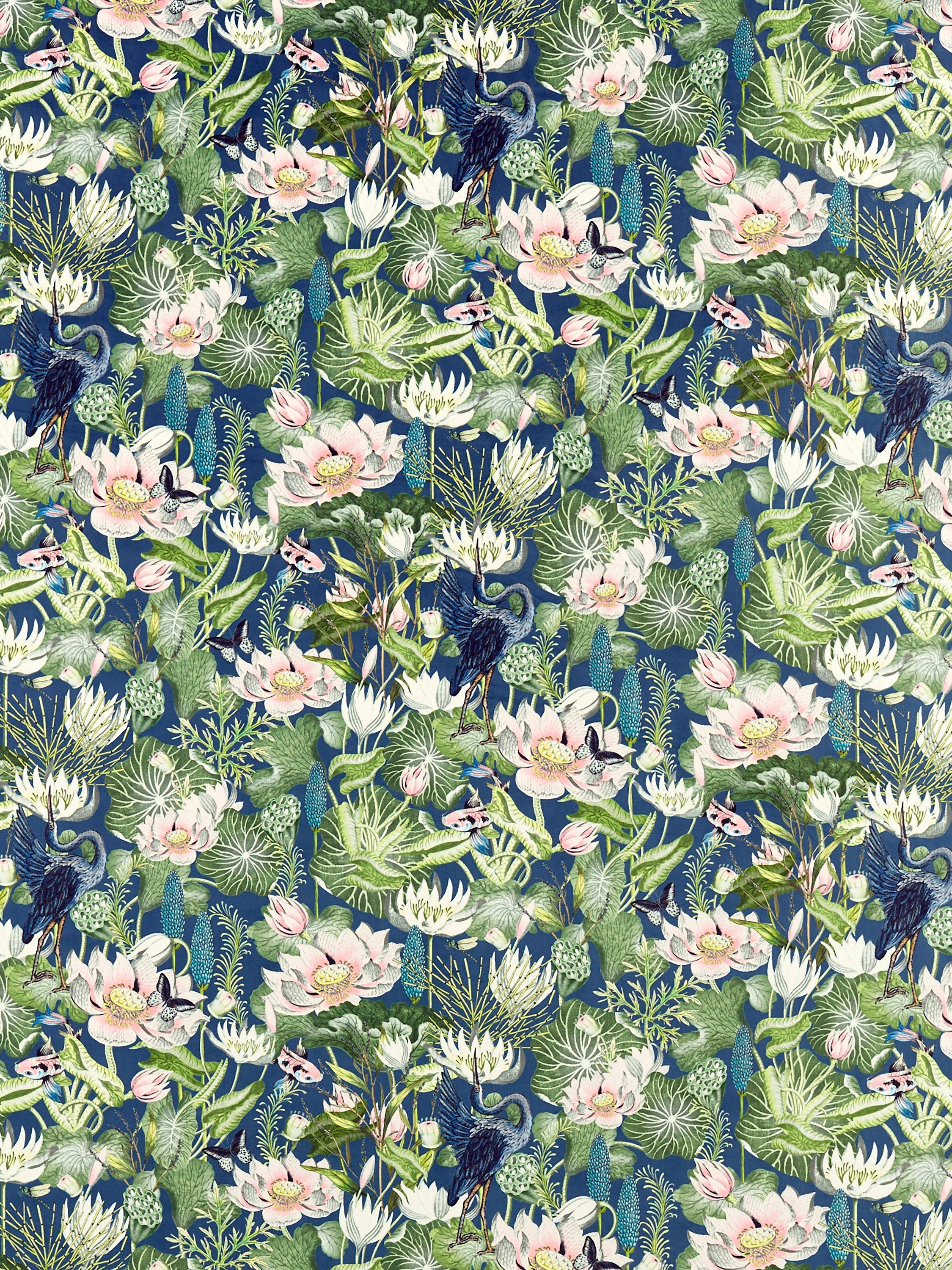 Deep within the Amazon basin, giant waterlilies thrive amongst shallow waters and tropical heat. Originally created during the 1800s, Waterlily has featured consistently within the Wedgwood archive ever since. It is thought the inspiration for this pattern came from John Wedgwood, Josiah's eldest son, founder of the RHS and enthusiastic horticulturalist. It's his passion that influenced this larger-than-life fabric, printed here on velvet but also available on a linen blend.