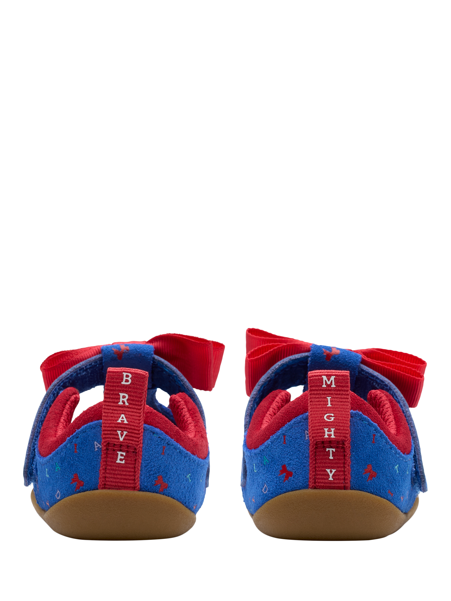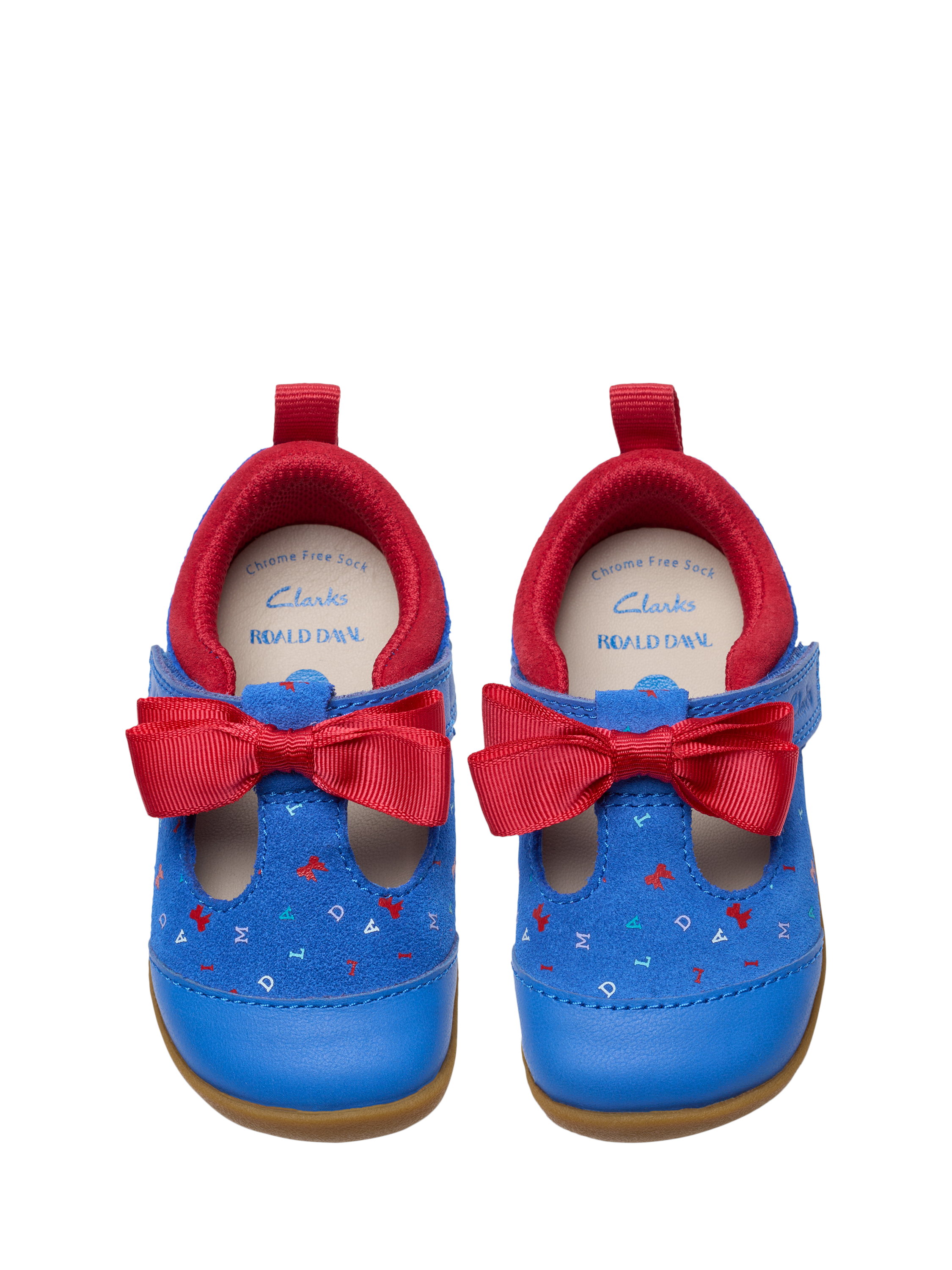 Inspired by the beloved Roald Dahl tale, these Flash Bow toddler's shoe transports tiny toes to Matilda's magical world. Crafted in blue leather with all-over Matilda lettering and topped off with a red bow to the strap- just like the one Matilda wears in her hair. And with soft padding and a grippy, flex-grooved sole, there's tonnes of support behind every super-brave, super-mighty step!