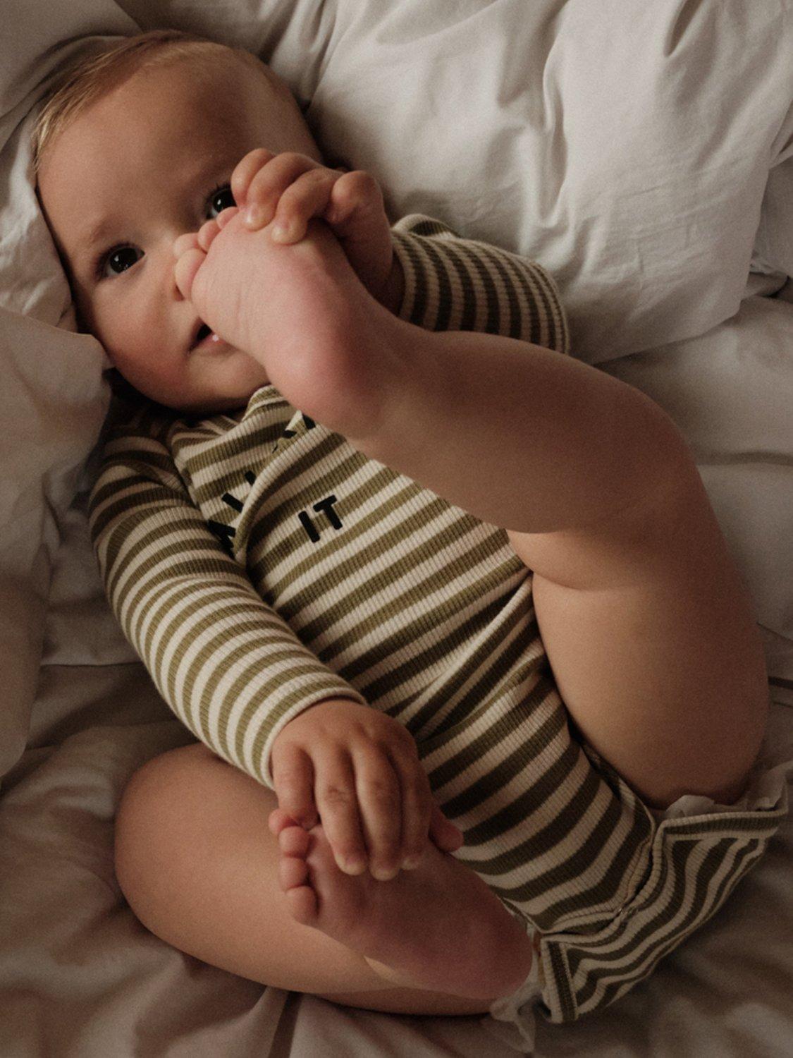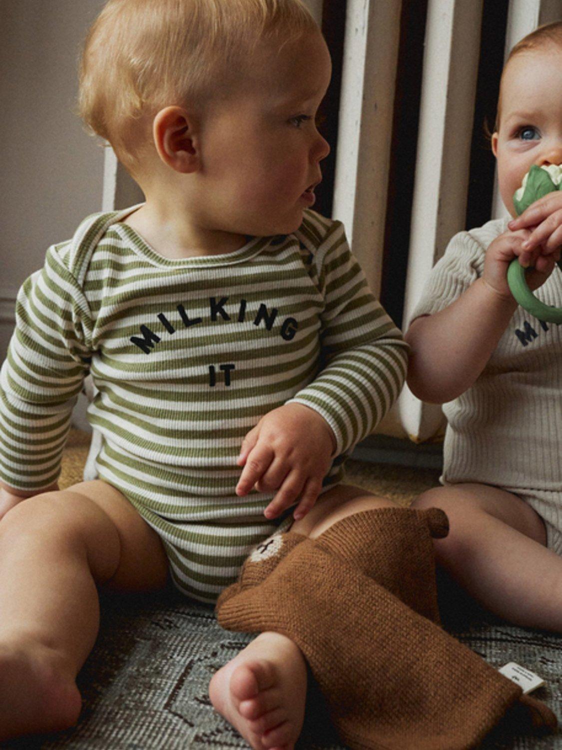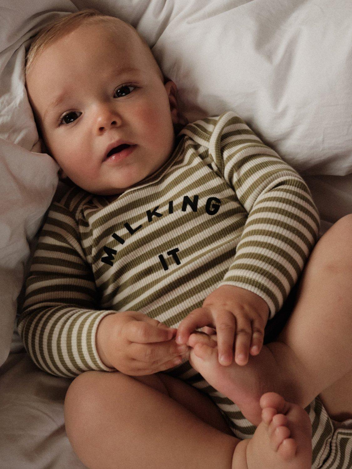 The Milking It Stripe Bodysuit is made with 97% organic cotton and 3% elastane rib for ultimate softness and stretch. The envelope neckline and popper fastening make it easy to change your little one. Unisex and stylish with a playful striped design. Comfort and convenience for both baby and parents. The best new addition to the iconic Milking It collection.