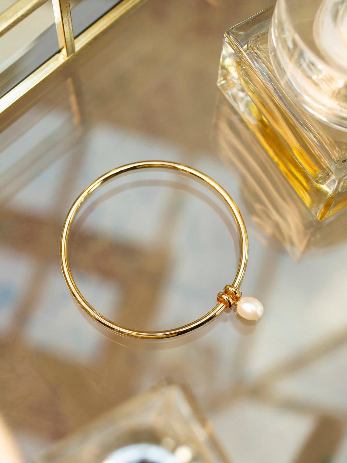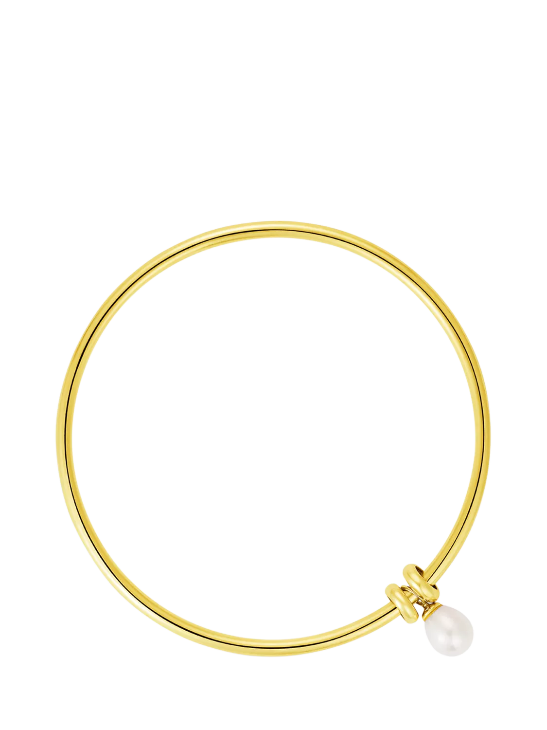 For Claudia Bradby, the pearl represents the power, and power for growth, within us all. The Essential Gold Bangle is about modern simplicity; a teardrop-shaped pearl charm and two gold hoops add delicate embellishment to our unique gold bangle, resulting in a contemporary piece that suits all occasions. This versatile bangle can be worn with your own bracelets or any of our lustrous Pearl Bracelets for easy layering style.
