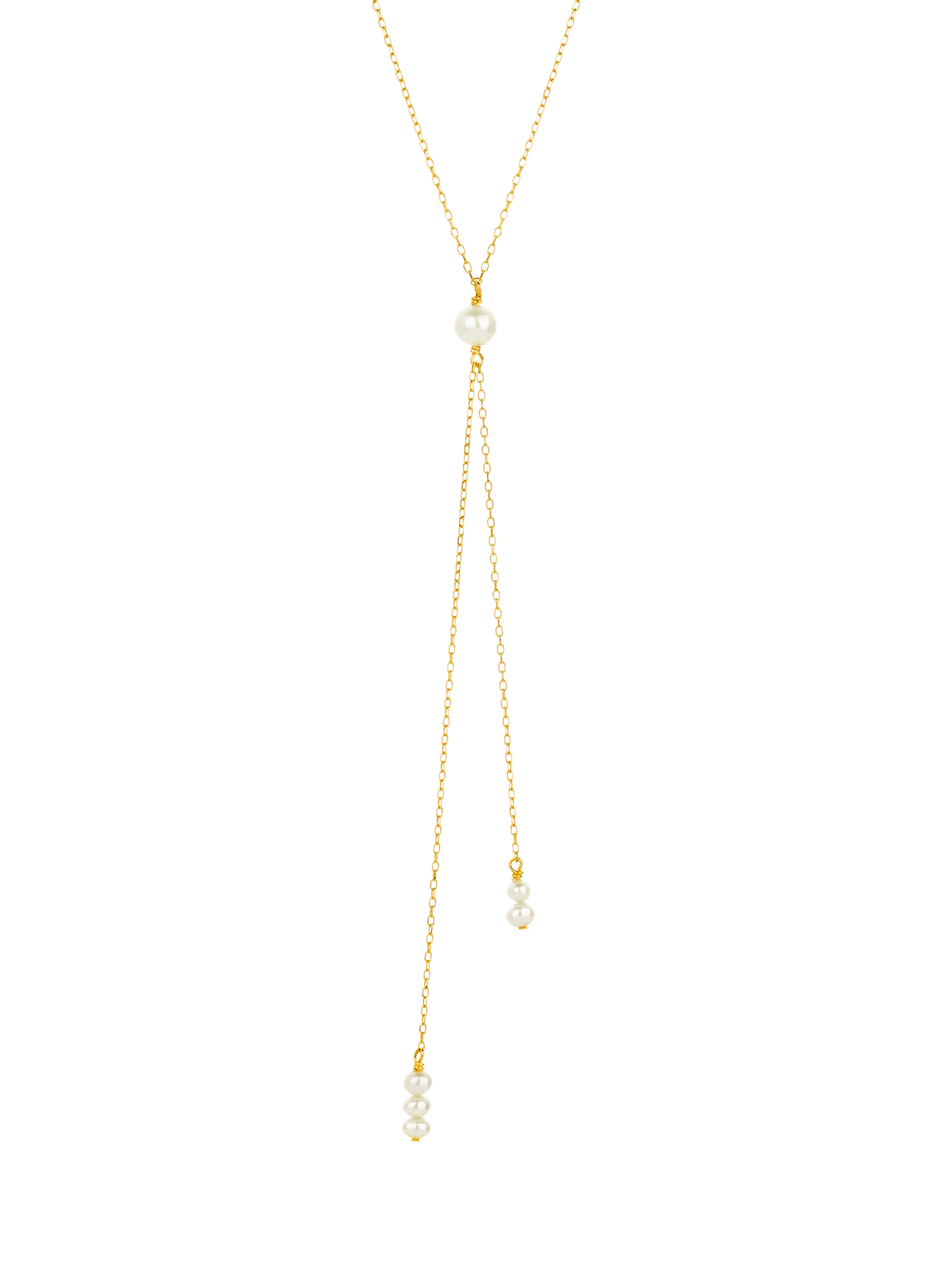 Calling all sirens of the sea, this beautiful pearl necklace design is a fixed lariat style, with hand selected pearls strung on diamond cut chain, plus an adjustable length to fit any neckline.