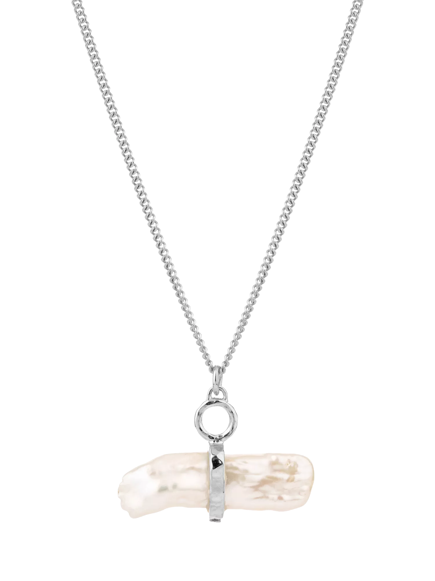 - Necklace length - 41cm+5cm +5cms Gemstone - 15-17mm x 6mm biwa freshwater pearl Silver band and loop - 5.5mm loop; 2mm hand hammered band circles the pearl to hold it, with a hidden pin internally to secure the pearl.