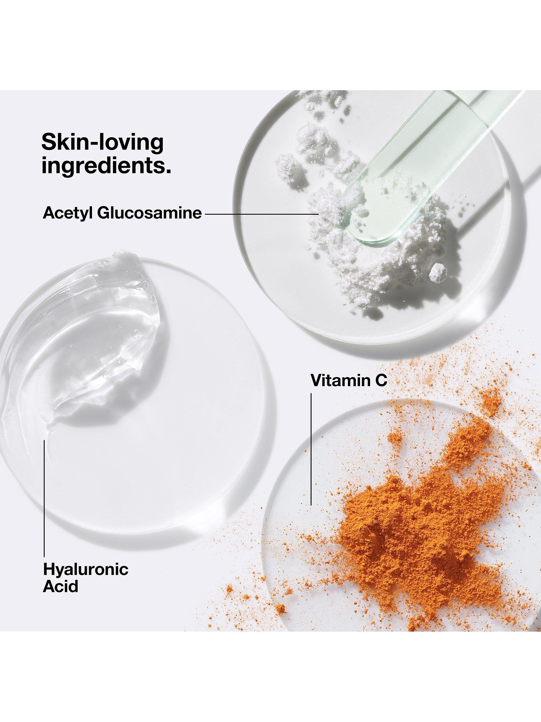 - With vitamin C and acetyl glucosamine, this powerful formula helps boost radiance, smooth the look and feel of skin, and even the look of skin tone