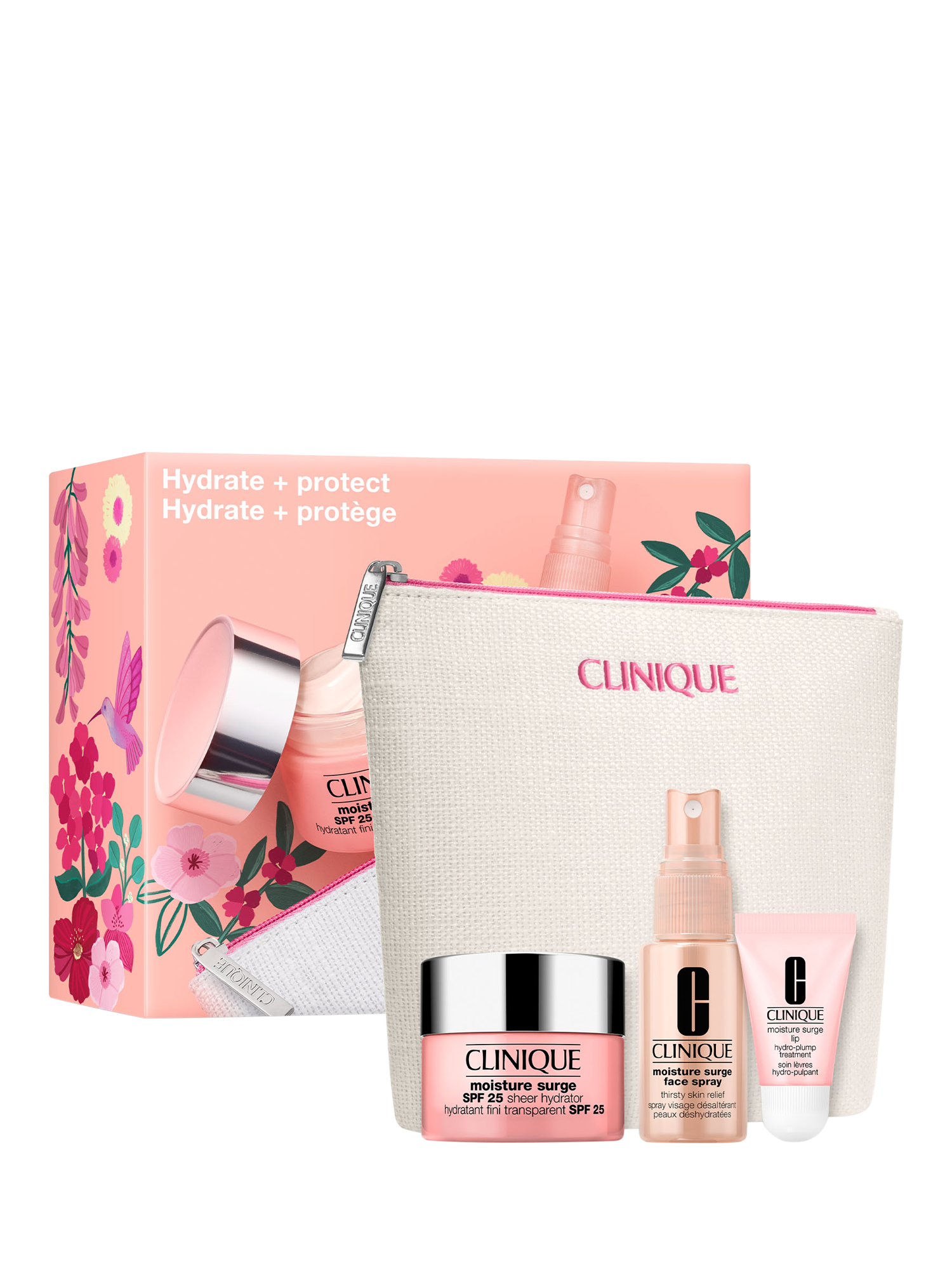- Set includes: Full Size Moisture Surge™ Sheer Hydrator Broad Spectrum SPF 25 50ml Moisture Surge™ Face Spray Thirsty Skin Relief 30ml Moisture Surge™ Lip Hydro-Plump Treatment 7ml Bag