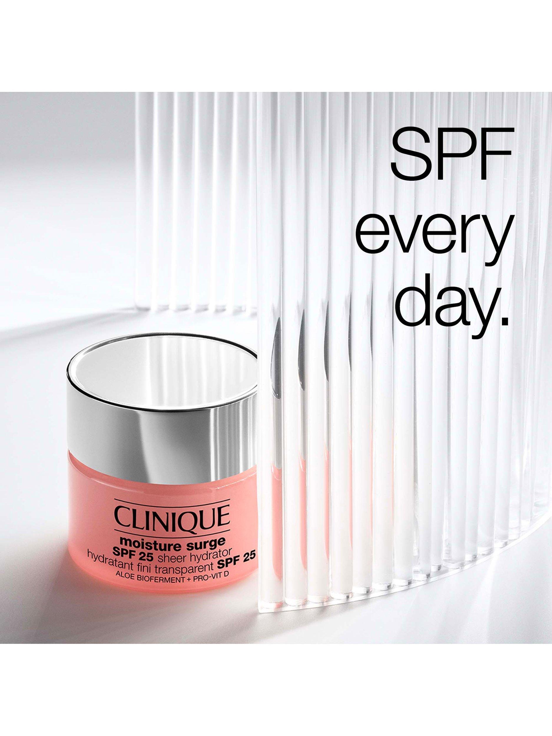 - Moisture Surge Sheer Hydrator Broad Spectrum SPF 25 hydrates and delivers sheer sun protection—even for deep skin tones