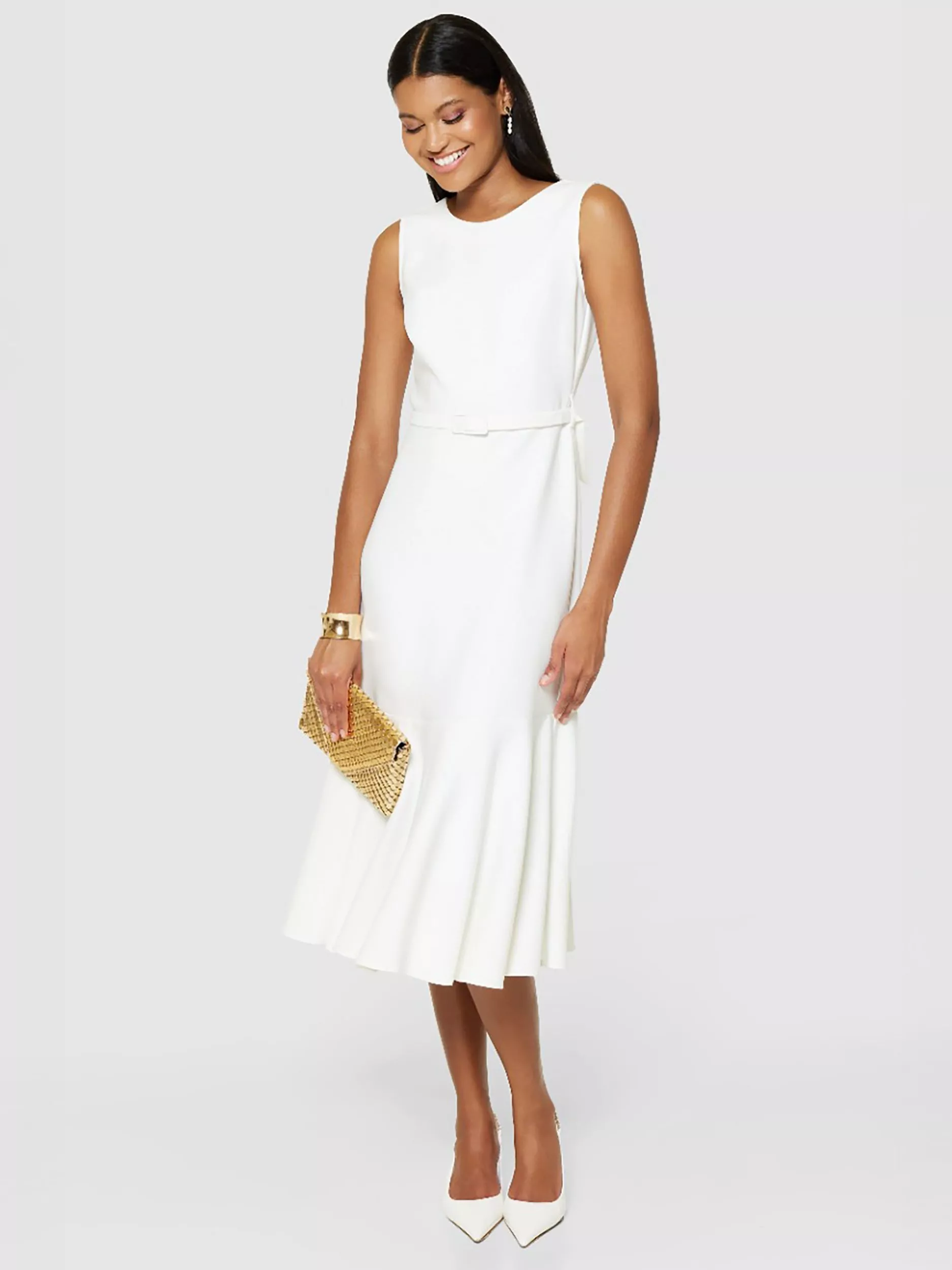 In an easy to wear shift shape with a fluted peplum hem, this mid-length dress from Closet London is crafted from a blend of fabrics. Defined with a conventional round neckline and a belted waist, this sleeveless style is minimally detailed for endless wearability.