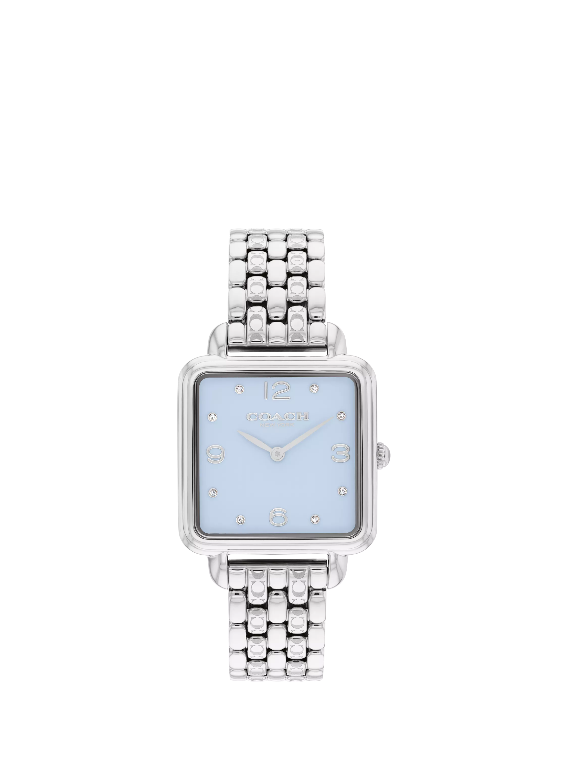 This women's Coach watch from the Cass family features a 28mm soft square stainless steel case, with light blue lacquered dial with crystal markers and is finished on a stainless steel bracelet with Signature C etching.