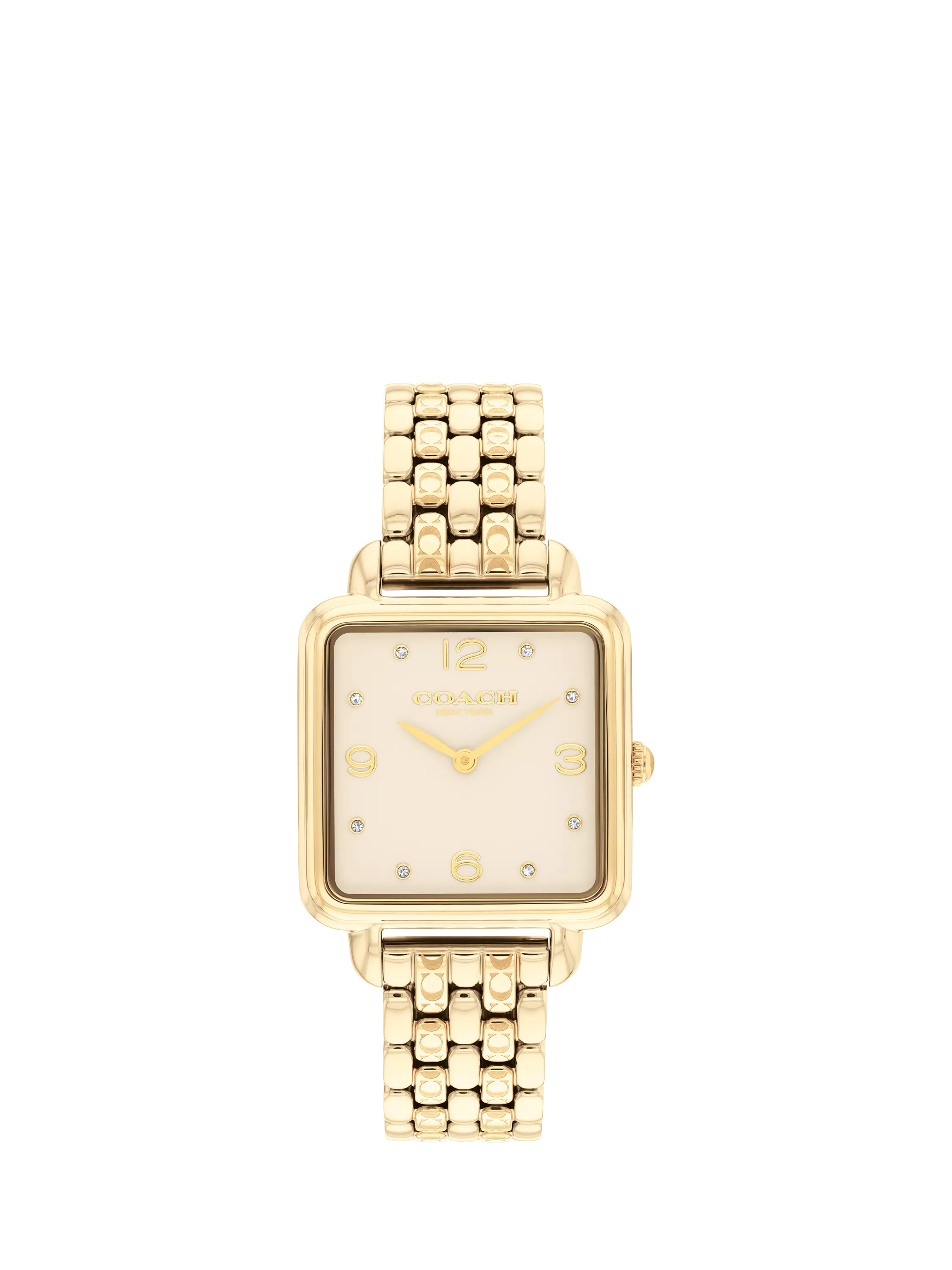 This women's Coach watch from the Cass family features a 28mm soft square stainless steel case, with champagne lacquered dial with crystal markers and gold IP bracelet with Signature C etching.