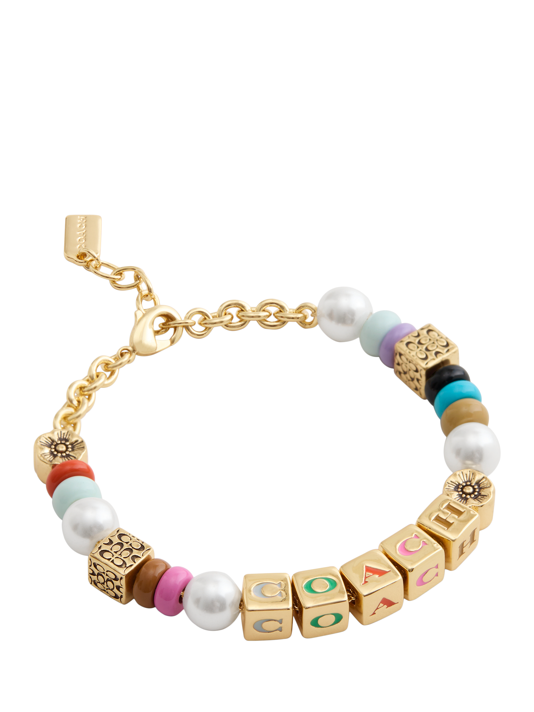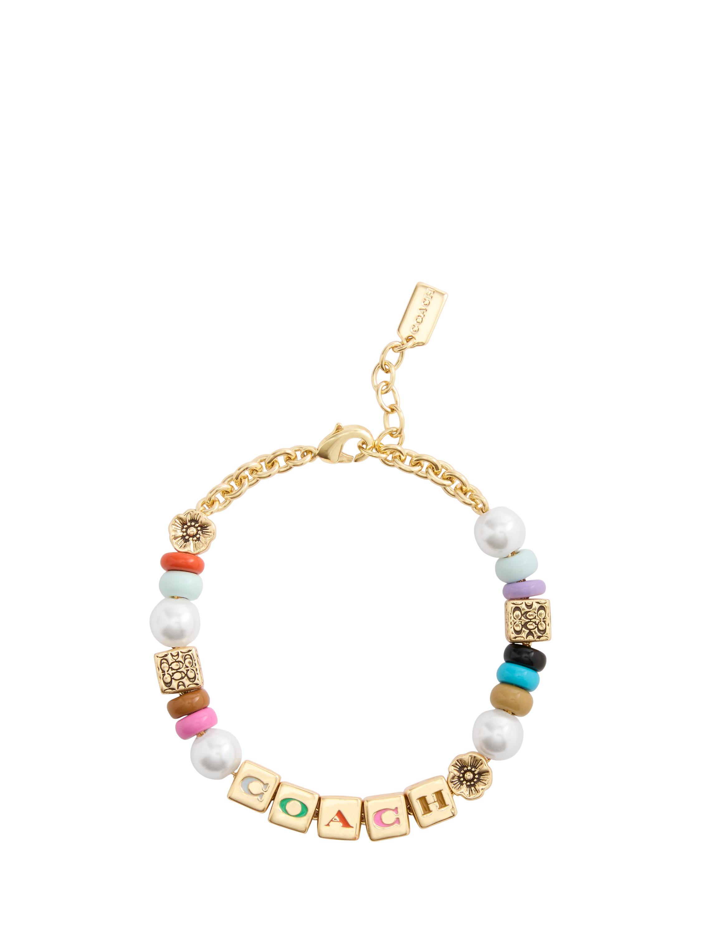 The bracelet has an adjustable lobster clasp closure. Made from brass, enamel and imitation pearls. Includes a signature Coach jewellery dustbag.