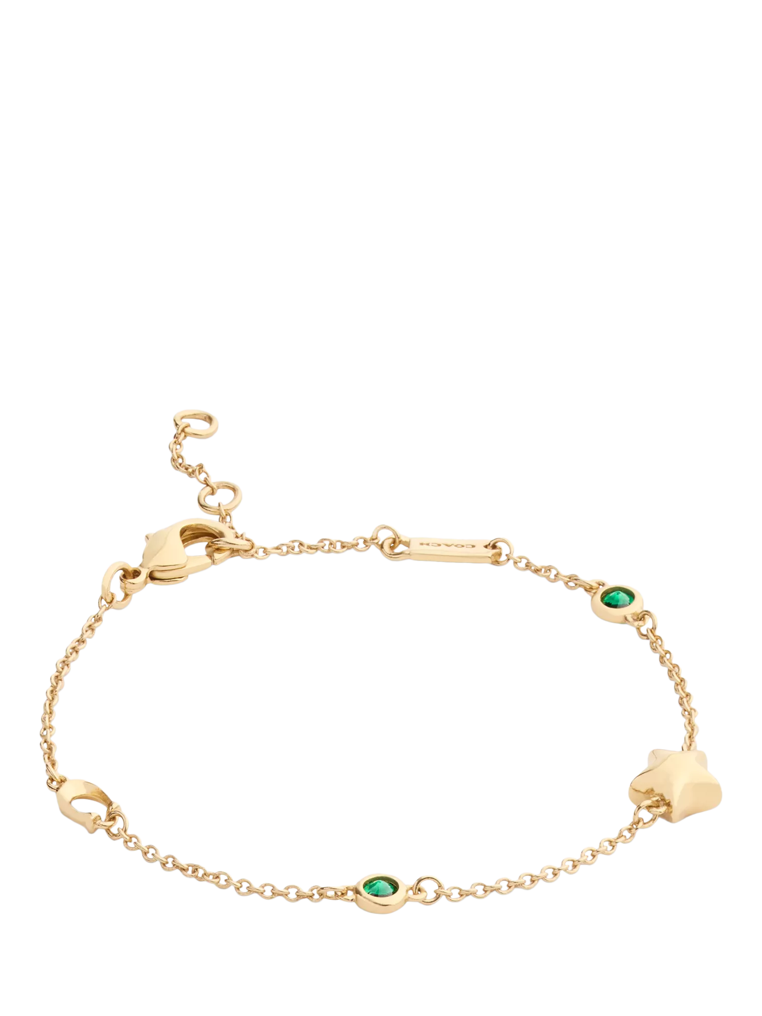 Refined chain link bracelet, featuring celestial mixed charms including a puffy star, signature sculpted C motif, and delicate green stones. Comes packaged in a signature COACH gift box. Fastens with an adjustable lobster clasp closure. Made from brass and glass crystal.