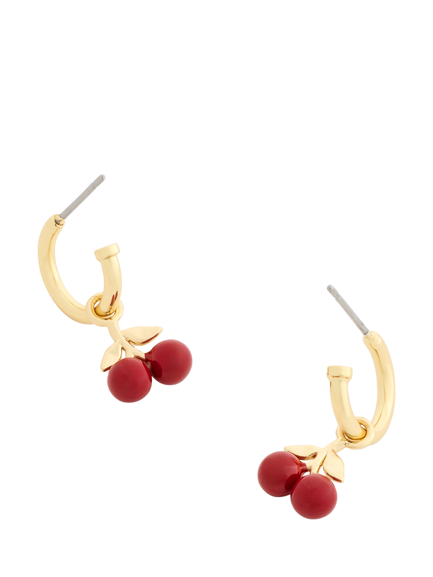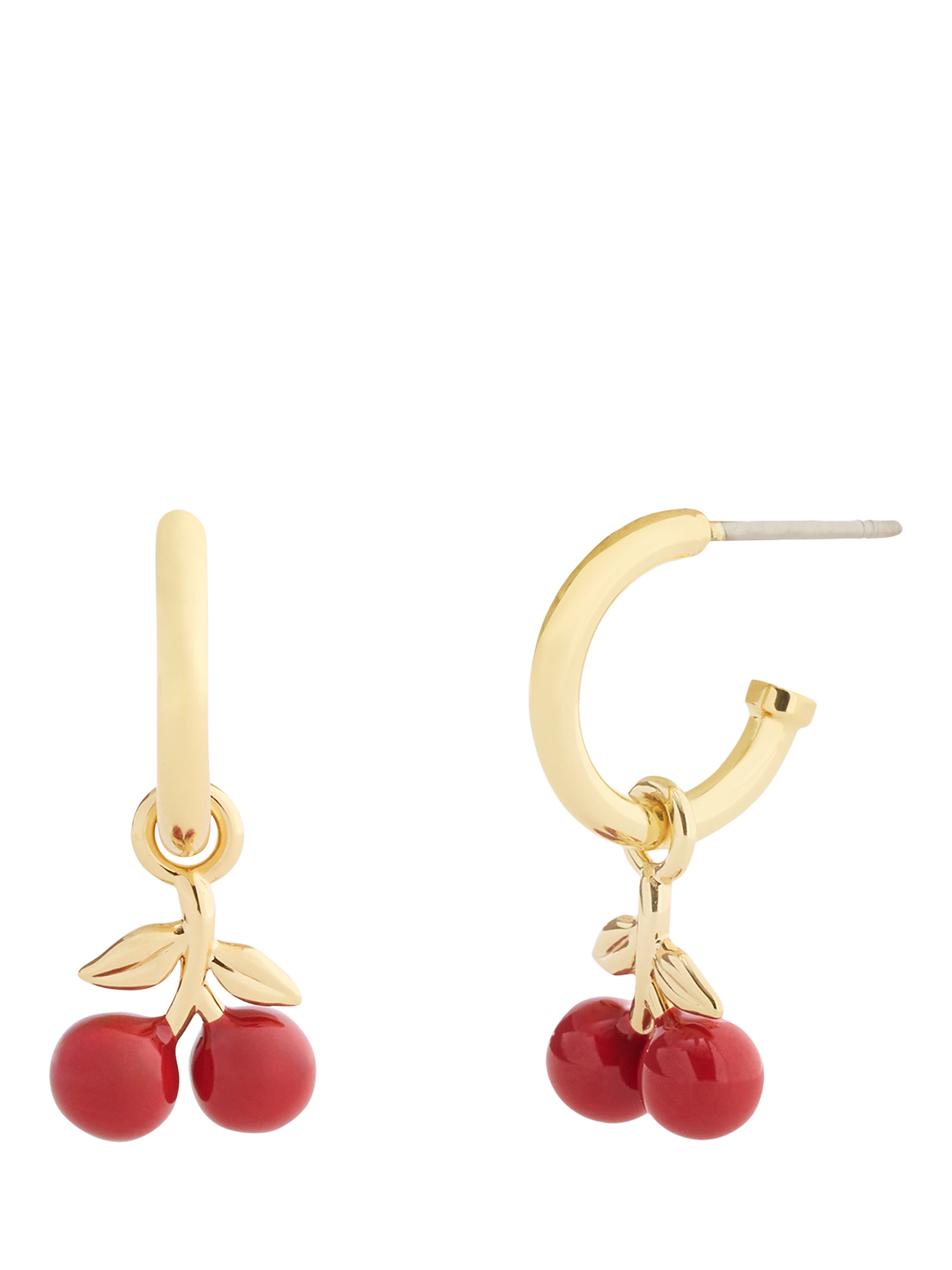 Refined huggie earrings, featuring an open silhouette paired with dangling vibrant red cherry charm. Posts are made from hypoallergenic titanium, perfect for everyday. Secured with a post-back closure. Suitable for pierced ears only.