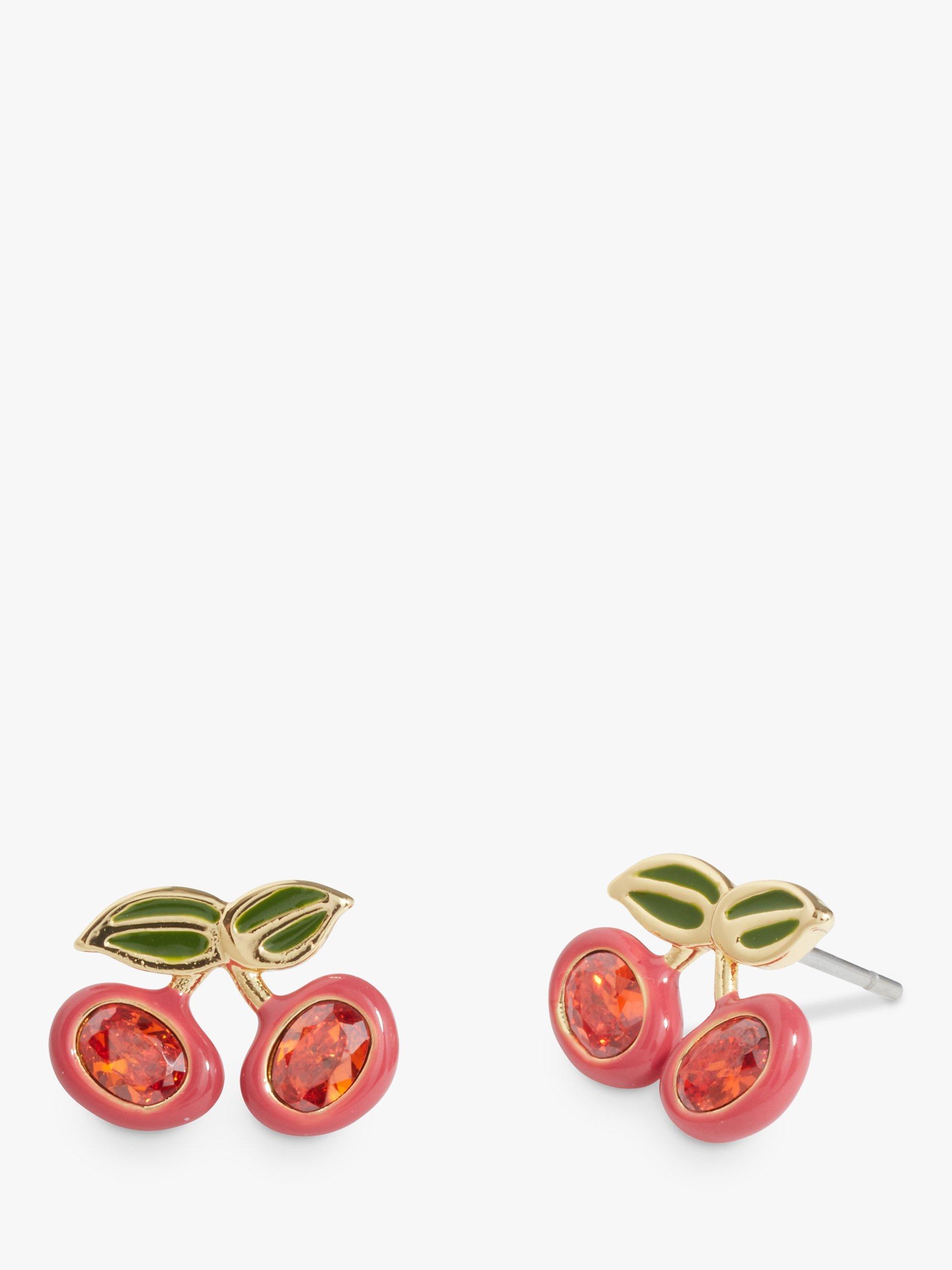 These playful stud earrings feature colourful red cherry clusters adorned with stone gems. Secured with posts that are for pierced ears only.