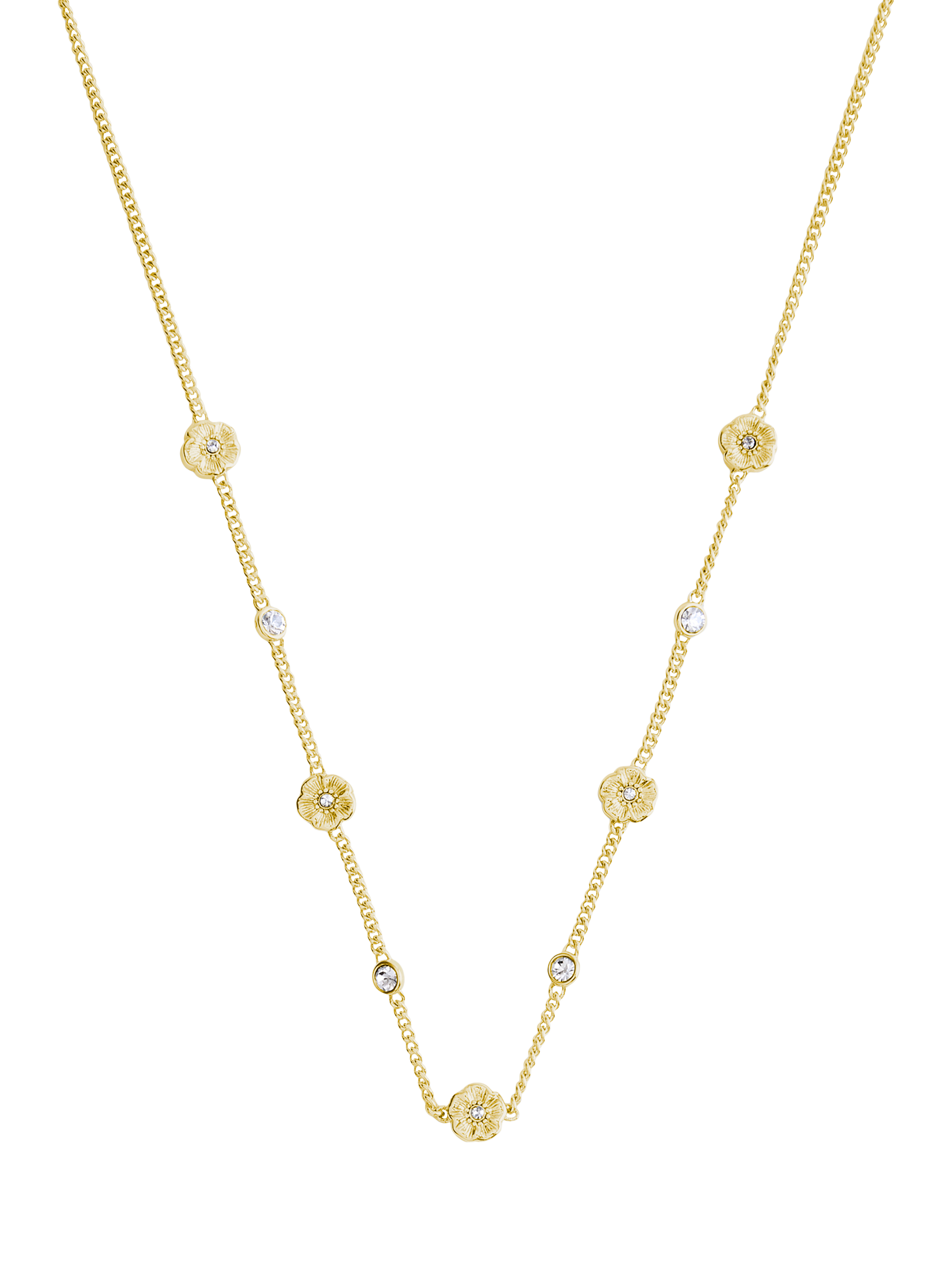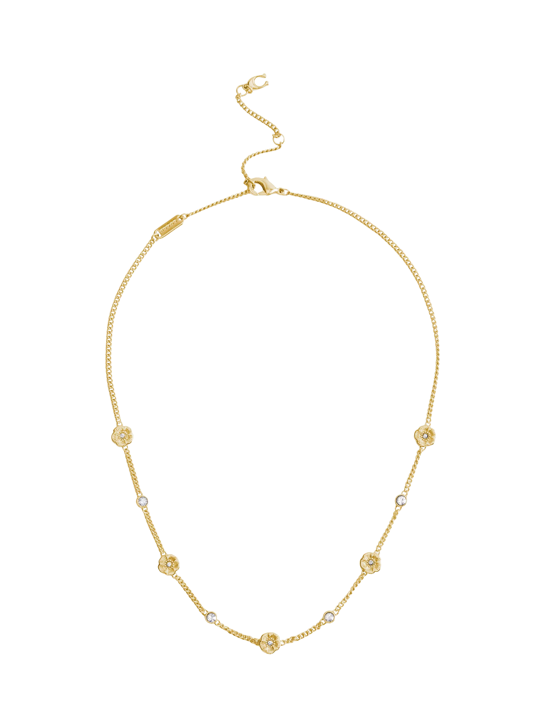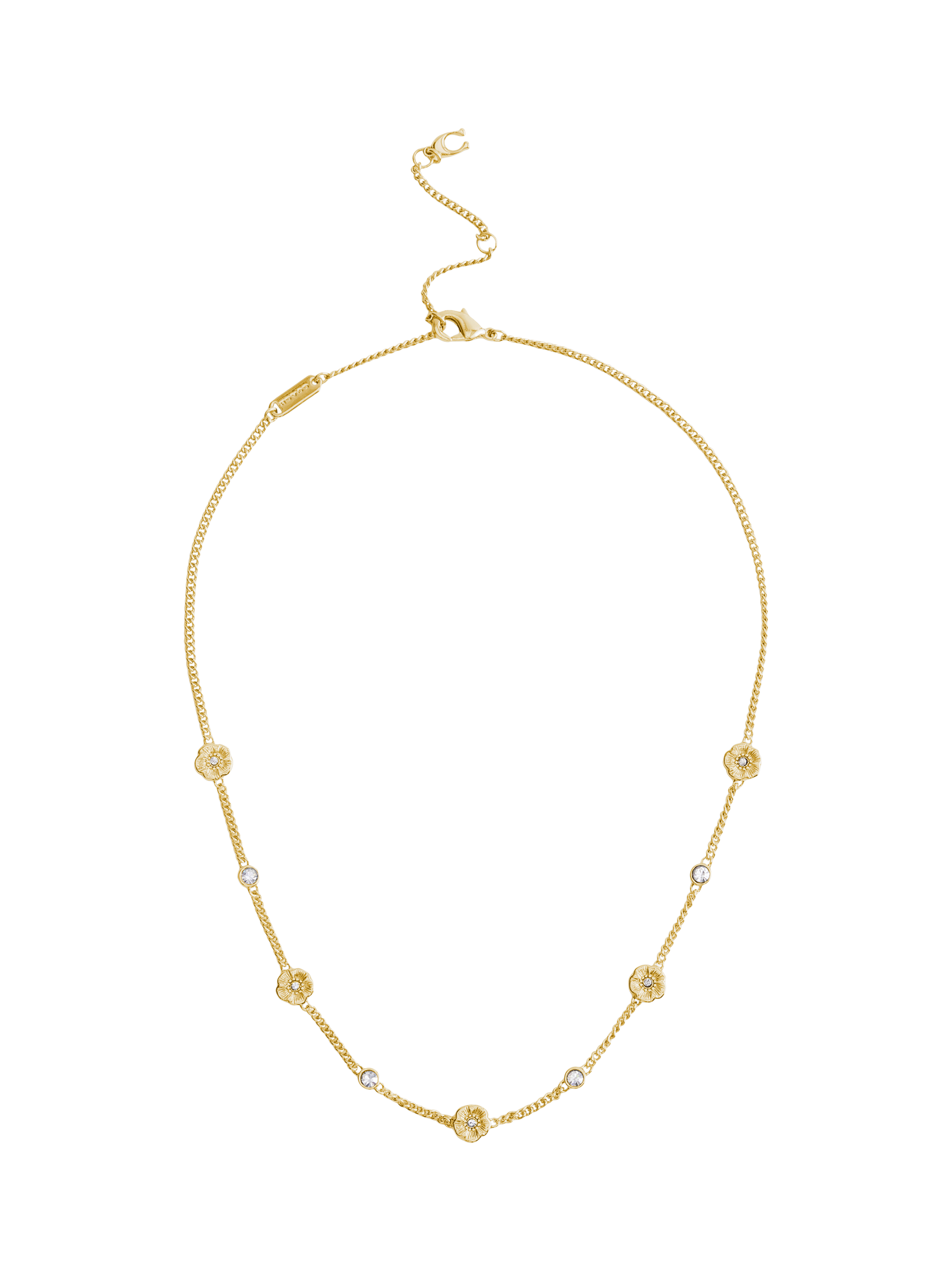 Refined curb chain strand necklace featuring signature tea roses and sparkly crystal stones perfect for everyday. Secured with an adjustable lobster clasp closure.