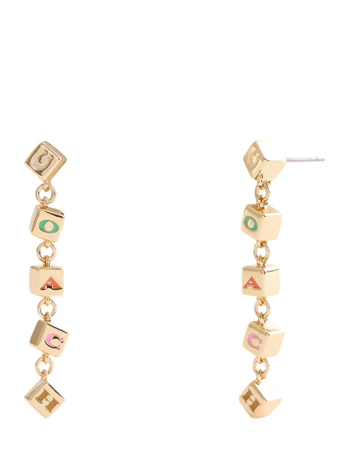 Charming refined chain linear earrings featuring playful cube beads spelling out a signature branded Coach in colourful enamel. Made from brass and enamel with hypoallergenic titanium posts. Includes a signature Coach jewellery dustbag.
