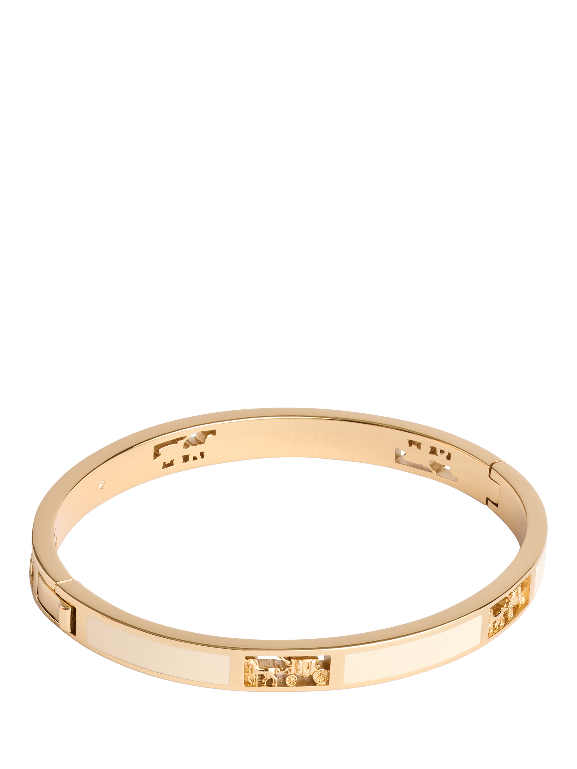 This everyday enamel-hinged bangle bracelet features iconic horse and carriage motif cutouts. The bracelet has an easy push hinge closure.