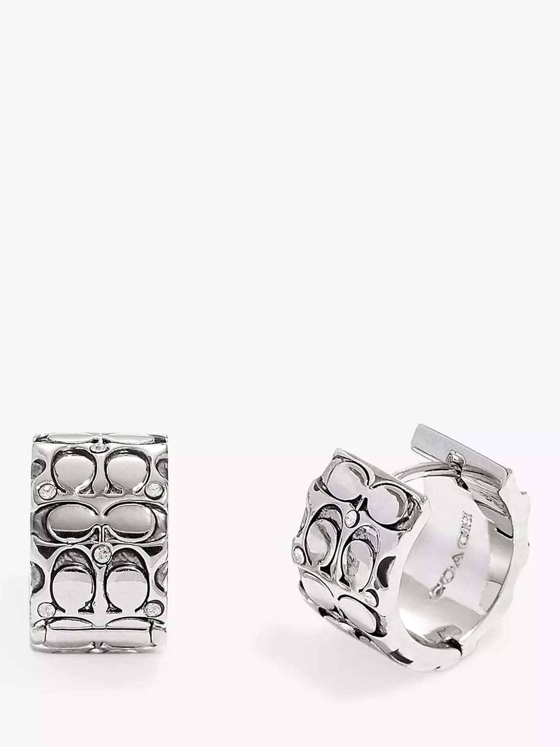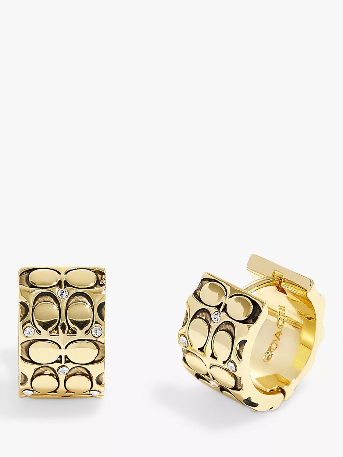 Step out in bold designer style. These wide huggie hoop earrings are engraved with Coach's signature quilted C's, and accented with delicate crystal stones. They are secured with click-in closures that are for pierced ears only.