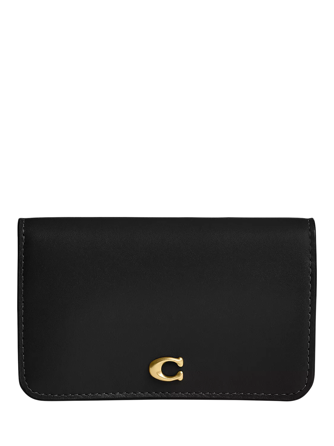 Detailed with signature Coach hardware, this sophisticated slim card case is big on organisation. Secured by a snap closure, the bifold design features multiple card slots, inside slip pockets for cash or receipts and a zip pocket for coins or small accessories. Crafted of refined leather, it's finished with an exterior slip pocket for easy access items.